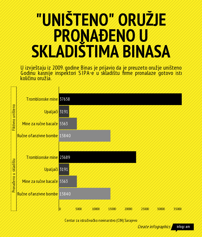 Krajem 2007. godine u Bugojno je iz skladišta u Gabeli dovezeno 2.930 čahura za artiljerijska oružja i 126 avioraketa. Za onesposobljavanje i uništenja ovog naoružanja Binasu je dva mjeseca kasnije isplaćeno oko 86.000 KM sa PDV-om.