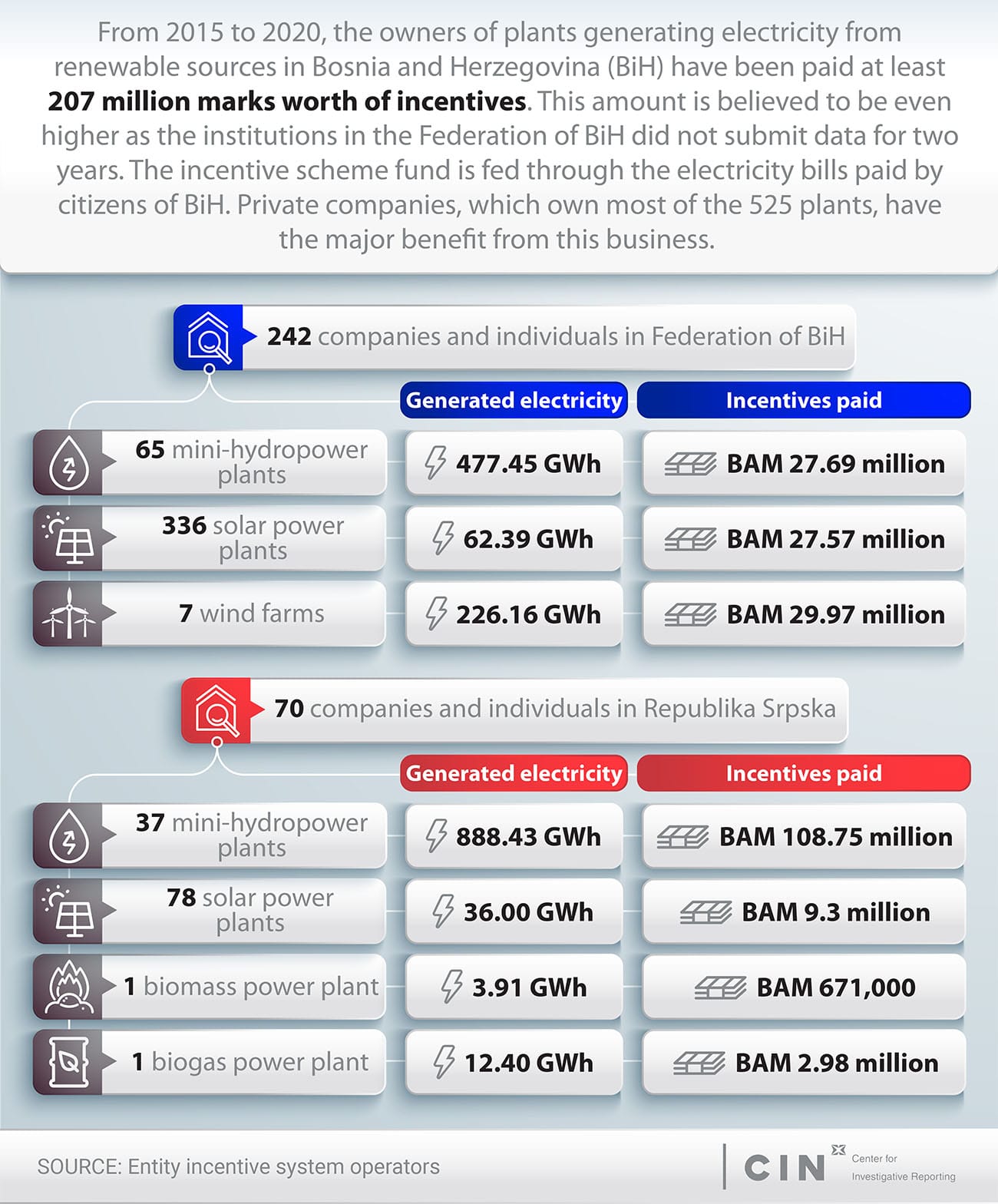 Every month, citizens of Bosnia and Herzegovina through their electricity bill pay a fee for electricity generation from renewable sources. Over six years, they paid at least BAM 207 million, which the Entity authorities distributed mainly to private companies as an incentive for the production of the so-called “clean electricity”. These companies are owners of 525 small hydropower plants (SHPPs), wind farms, solar, biomass and biogas plants that produce about two percent of the country’s total electricity production, and generate large revenues from the incentives.
