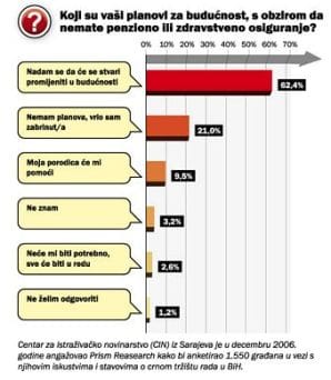 Na pitanje koji su vaši planovi za budućnost, s obzirom da nemate penziono i zdravstveno osiguranje, 62 odsto radnika na crno je odgovorilo kako se nada da će se stvari u budućnosti promijeniti.