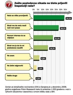 Odgovori pokazuju da većina radnika na crno ne bi prijavilo poslodavce iako oni krše njihova, zakonom zagarantirana prava. Oko 51 odsto zaposlenih ispitanika navodi niz razloga zašto ne bi prijavili poslodavce. Među najčešćim izgovorima su mišljenje da se ništa ne može promijeniti, te strah da neće moći naći novi posao u budućnosti.