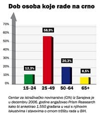 Istraživanje entitetskih i državnog zavoda za statistiku je otkrilo da su dvije trećine radnika na crno muškarci, a gotovo 60 odsto njih je u dobi između 25 i 49 godina starosti. Najviše je ipak radnika na crno sa srednjoškolskom diplomom, dok njih, oko 79 odsto živi na selu.