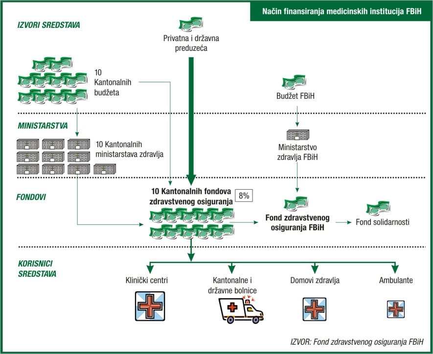 Međutim, mnogi zdravstveni radnici vjeruju da se milioni rasipaju na finansiranje mobitela i drugih potreba napuhane administracije podijeljene na 13 fondova zdravstvenog osiguranja, 13 ministarstava zdravstva i 264 zdravstvene institucije koje upošljavaju 36.500 medicinskih i nemedicinskih radnika u Bosni i Hercegovini.