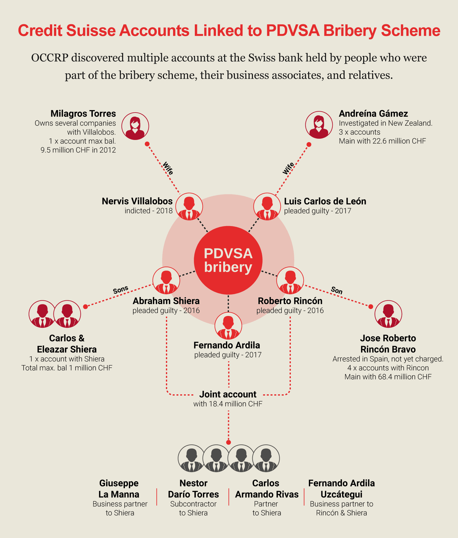 Many of the Credit Suisse accounts were jointly owned between people involved in the scheme and their family members. Another two belonged to people who worked closely with Rincón and Shiera as PDVSA contractors. In total, reporters found seven people associated with suspects had accounts, which at their maximum held a total worth at least 20.1 million Swiss francs.
