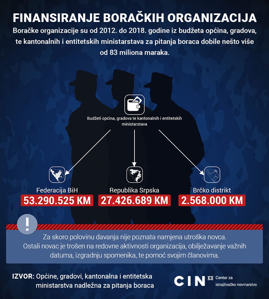 Centar za istraživačko novinarstvo (CIN) je kreirao online bazu podataka o finansiranju boračkih udruženja u Bosni i Hercegovini (BiH). U bazi se nalaze podaci o izdvojenih 83,2 miliona KM iz budžeta općina, gradova, kantona, entiteta i Brčko distrikta od 2012. do 2018. godine za funkcionisanje ovih udruženja. Riječ je o redovnim i planiranim isplatama iz budžeta koje ne uključuju direktnu i pojedinačnu pomoć borcima te njihovo stambeno zbrinjavanje ili pomoć njihovim porodicama.