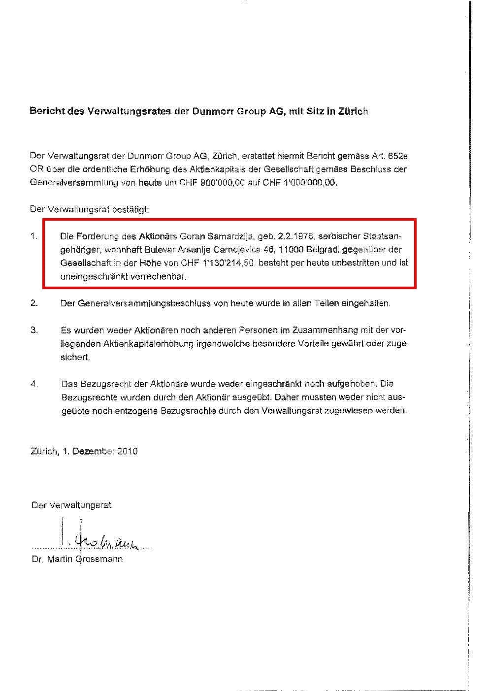 Tokom 2010. godine firmu je dokapitalizovao Goran Samardžija iz Beograda. On je uplatom od preko 1,13 miliona CHF dobio 9.000 dionica, čime je povećao broj dionica Dunmorr Group na 10.000. Trenutno je nepoznato u kakvom su srodstvu Goran i Zoran Samardžija.