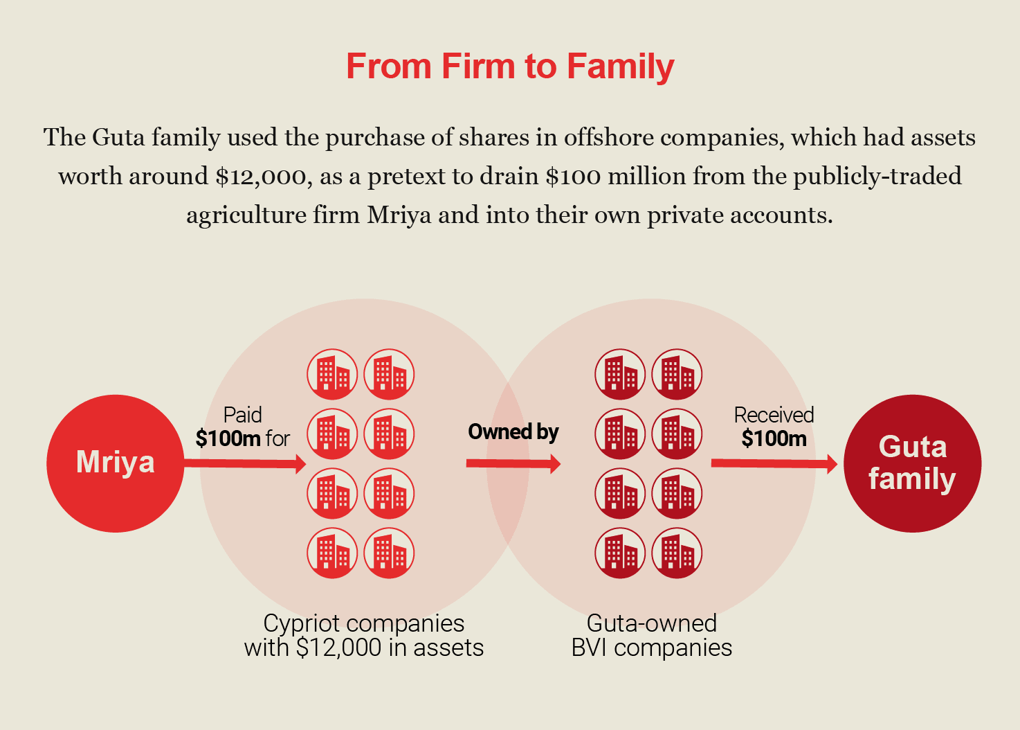 Mriya paid the funds to eight companies in the British Virgin Islands (BVI), each of which owned the shares of one of the Cypriot firms. The eight BVI companies were owned by members of the Guta family, according to court documents. In most instances, the BVI companies did not even transfer the shares to Mriya.
