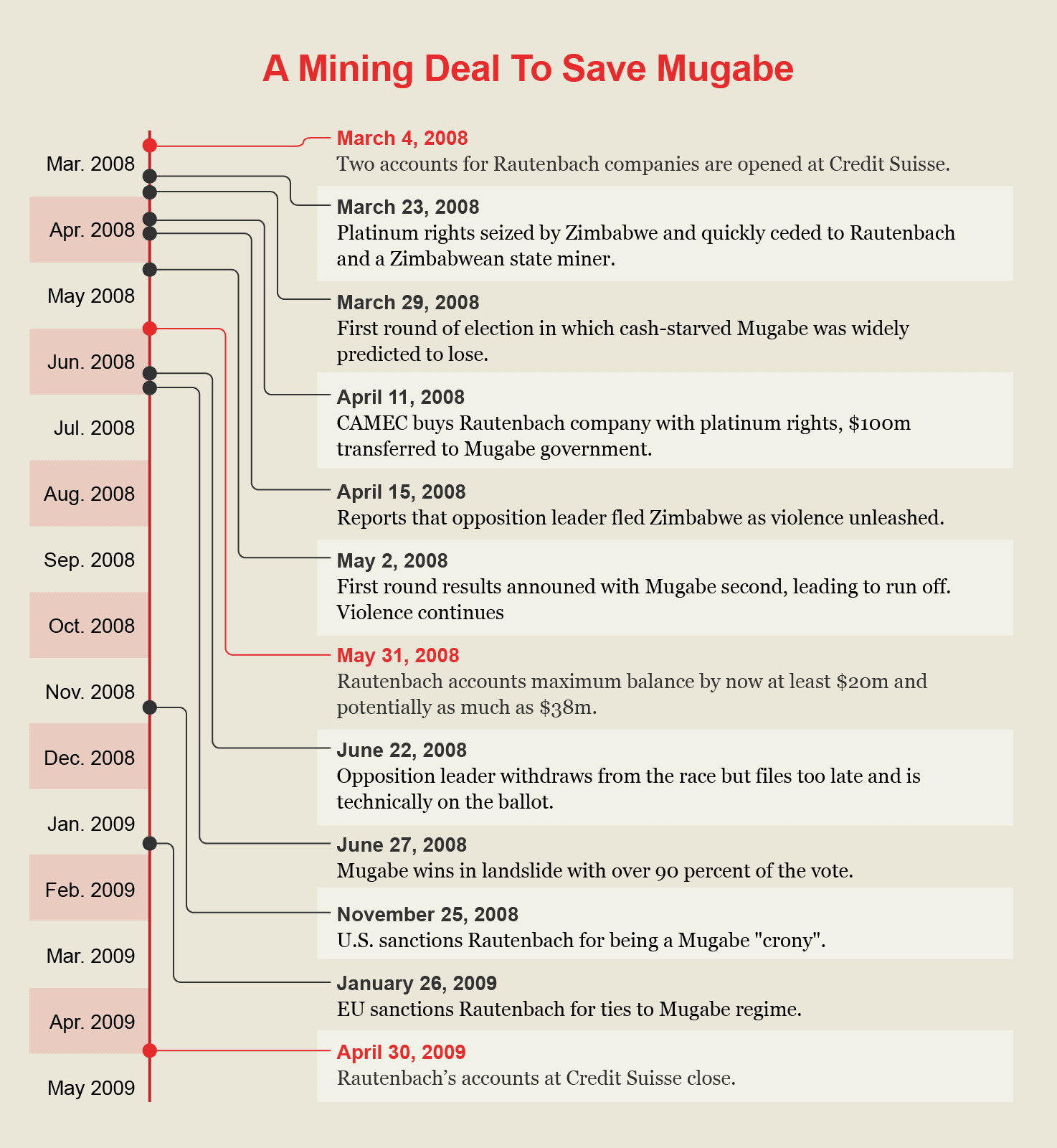 Dana 4. marta 2008. počinje lanac događaja koji će Mugabeovoj administraciji brzo priskrbiti prijeko potrebni novac za kampanju za reizbor, a Rautenbachu donijeti znatnu zaradu. Prema procurenim bankovnim podacima, koji su dio istrage „Suisse Secrets“ kojom koordinira OCCRP i koja se temelji na ogromnoj količini bankovnih podataka dostavljenih listu „Süddeutsche Zeitung“, sve je počelo kada je Rautenbach otvorio dva računa u „Credit Suisse“.