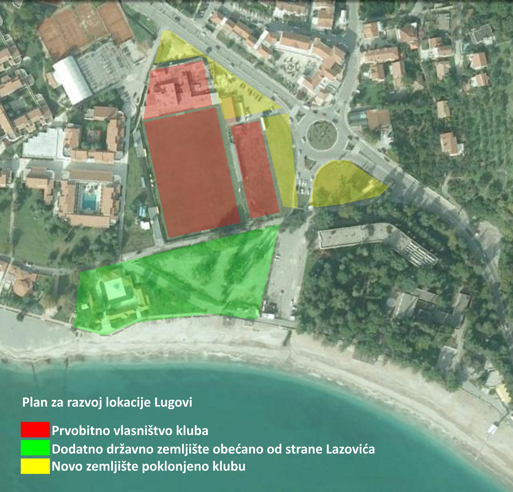 Tom prilikom su vlasti klubu dodijelile još nekoliko parcela u neposrednoj blizini starog stadiona. Zemljište vrijedno 7 miliona eura se nalazilo na Lugovima, uz obalu mora, u blizini turističkog kompleksa Slovenska plaža, koja je dobila ime po Česima koji su tu ljetovali davne 1935. godine. Lazović je tada obećao da klub neće prodati svoje novo itekako vrijedno javno zemljište.