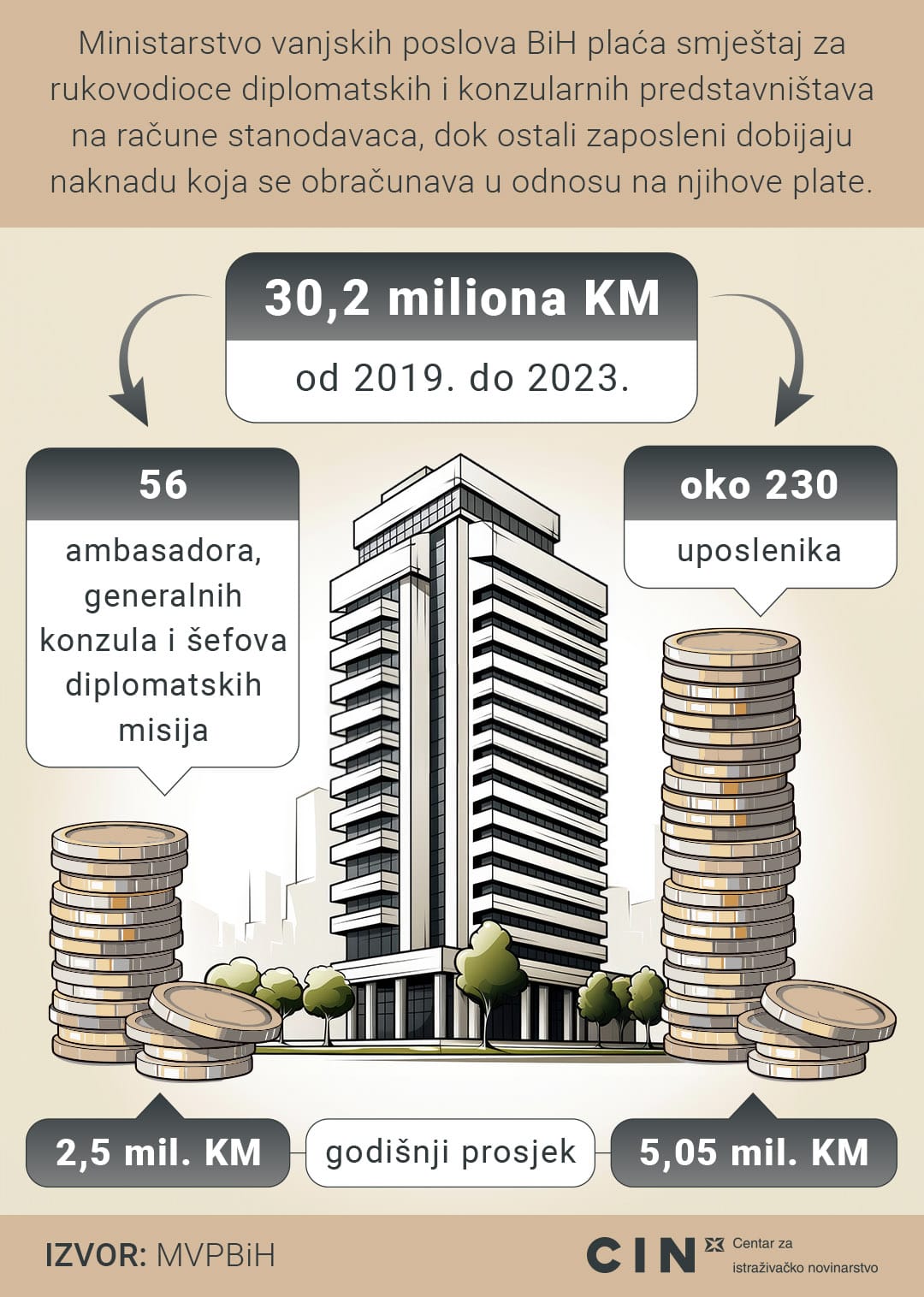 Ministarstvo vanjskih poslova Bosne i Hercegovine (BiH) godišnje isplati oko 5 miliona maraka za smještaj oko 230 zaposlenih u 56 diplomatsko-konzularnih predstavništava (DKP) u svijetu.