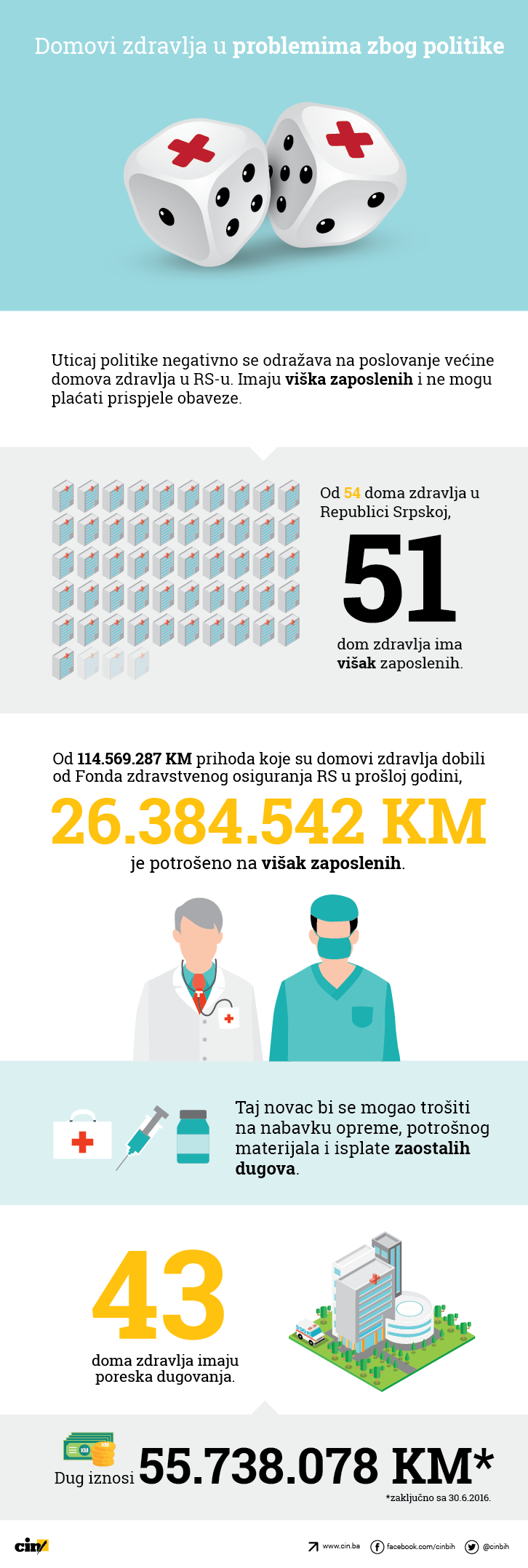 Prema istraživanju CIN-a, najmanje 30 aktuelnih i bivših direktora domova zdravlja u RS-u su članovi političkih partija. Najmanje njih devet su u isto vrijeme bili i direktori i skupštinski vijećnici, a 15 direktora domova zdravlja su kandidati na ovogodišnjim izborima.