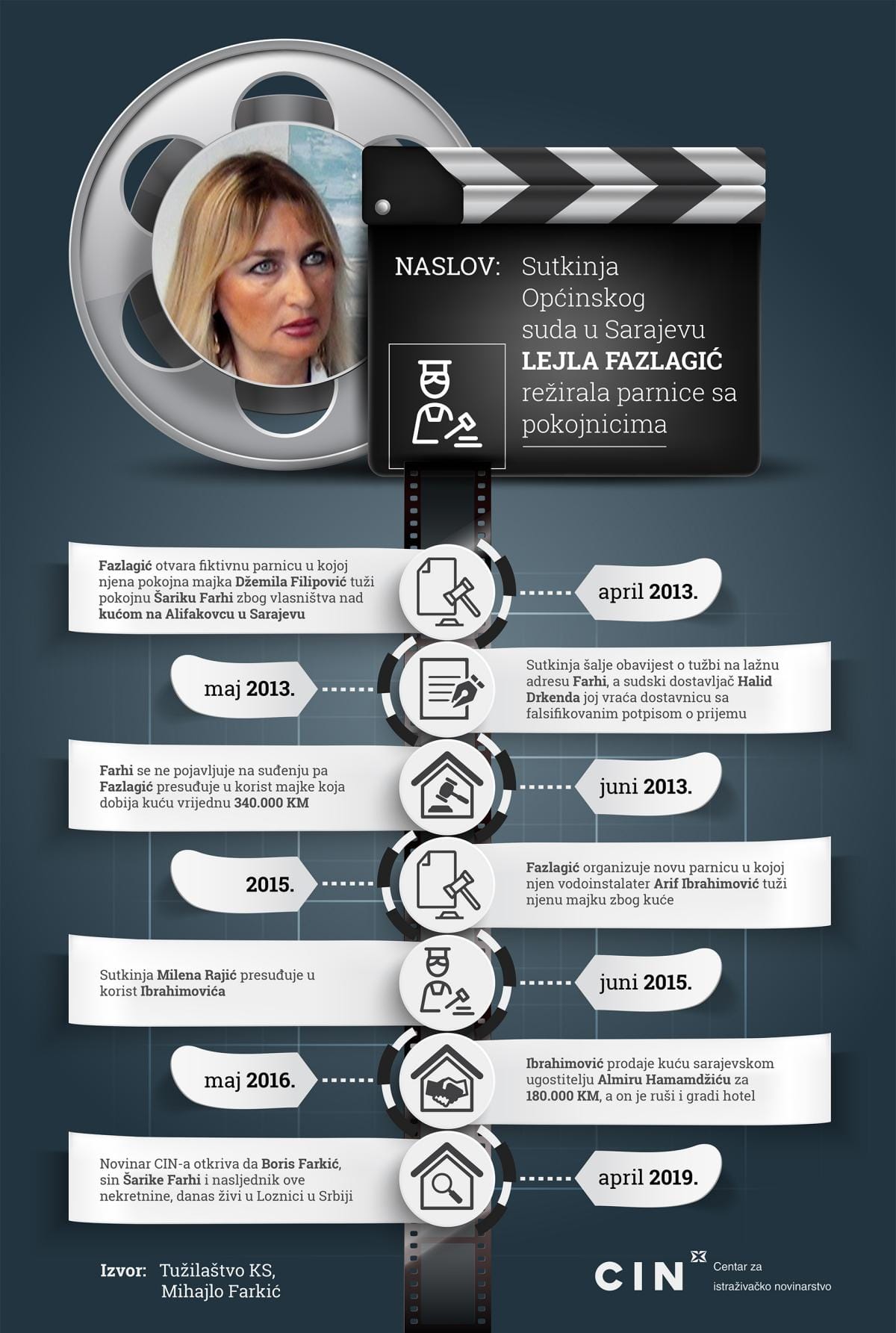 Centar za istraživačko novinarstvo (CIN) je u aprilu 2019. godine pisao o ilegalnim postupanjima bivše sutkinje Lejle Fazlagić koja se trenutno nalazi u Hrvatskoj. Kantonalno tužilaštvo u Sarajevu je protiv nje podiglo optužnicu 2018. godine jer je, između ostalog, u periodu od 2011. do 2016. godine ilegalno preknjižila imovinu desetina vlasnika sarajevskih nekretnina. U pitanju je imovina stradalih sarajevskih Jevreja, drugih preminulih građana i pojedinih preduzeća. Posljedica spornih presuda sutkinje Fazlagić je nezakonito preknjižavanje 19 nekretnina čija je procijenjena vrijednost skoro osam miliona KM, navedeno je u optužnici. Ona sama je prisvojila dvije nekretnine u najužem dijelu grada. Stanove je namjeravala prodati, ali u tome nije uspjela jer joj je Tužilaštvo KS blokiralo imovinu.