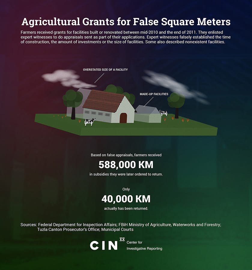 Inspectors have refuted opinions by 22 construction expert witnesses because they falsely established the time of construction, and overstated property investment or the size of facilities. Some also described nonexistent facilities. Based on appraisals such as these, farmers collected a 588,000 KM in grants from the Federation of Bosnia and Herzegovina (FBiH) Ministry of Agriculture, Waterworks and Forestry. Later they were ordered to return the money, but not one-tenth of the amount has been returned.