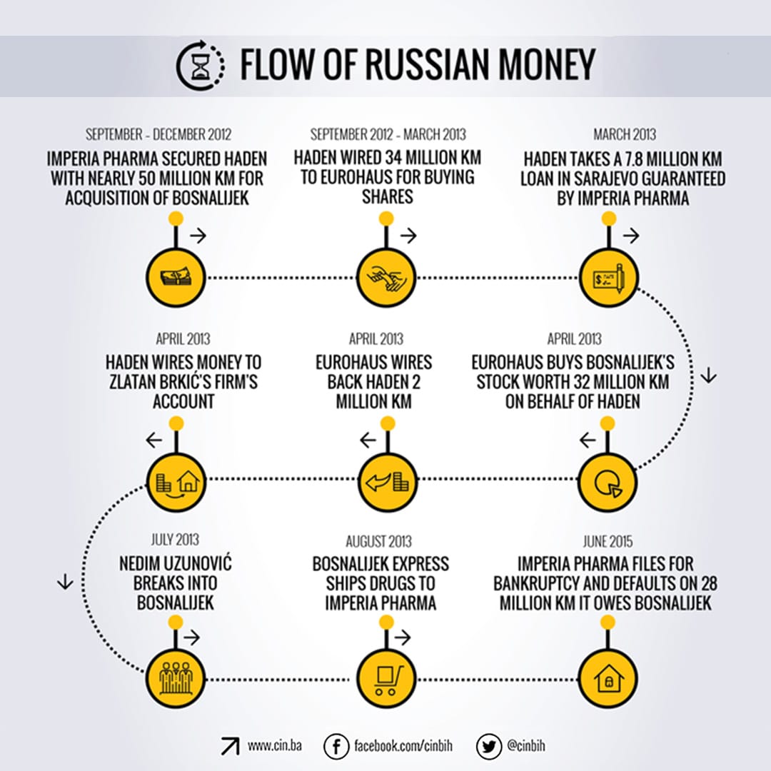 Through a series of texts, CIN journalists described the controversial Russian takeover of Bosnalijek shares and the role played by director Nedim Uzunović and owner and employee of the Eurohaus brokerage house Zijad Blekić and Edin Dizdar.