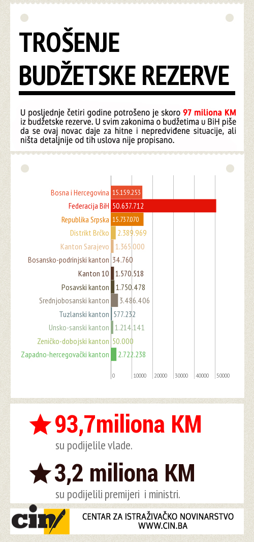 Nearly 97 million KM from the budget reserve has been given away in the past four years. All budget laws in BiH read that this money is to be given only for emergency and unanticipated events, but there is exact definition. This leaves it up to the ministers and mayors to decide.
