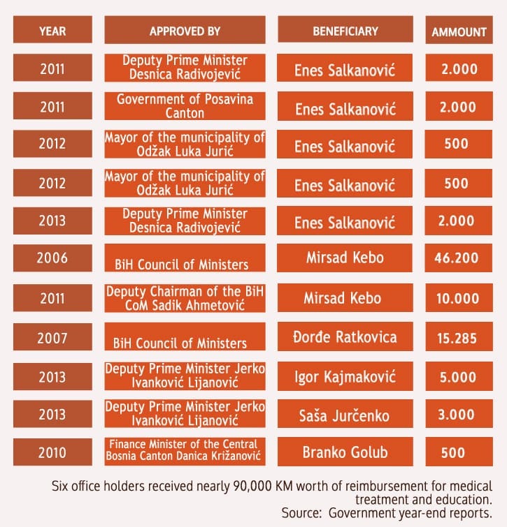 According to an investigation by the Center for Investigative Reporting in Sarajevo (CIN), almost 90,000 KM from the budget reserves went for medical treatment of officeholders, politicians or their children. The prime ministers or their deputies who have discretionary right over the fund signed off on the money for Salkanović and five other persons.
