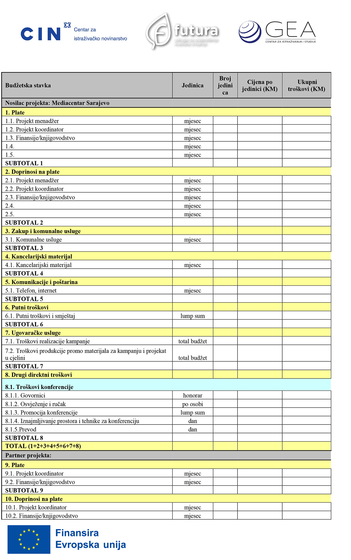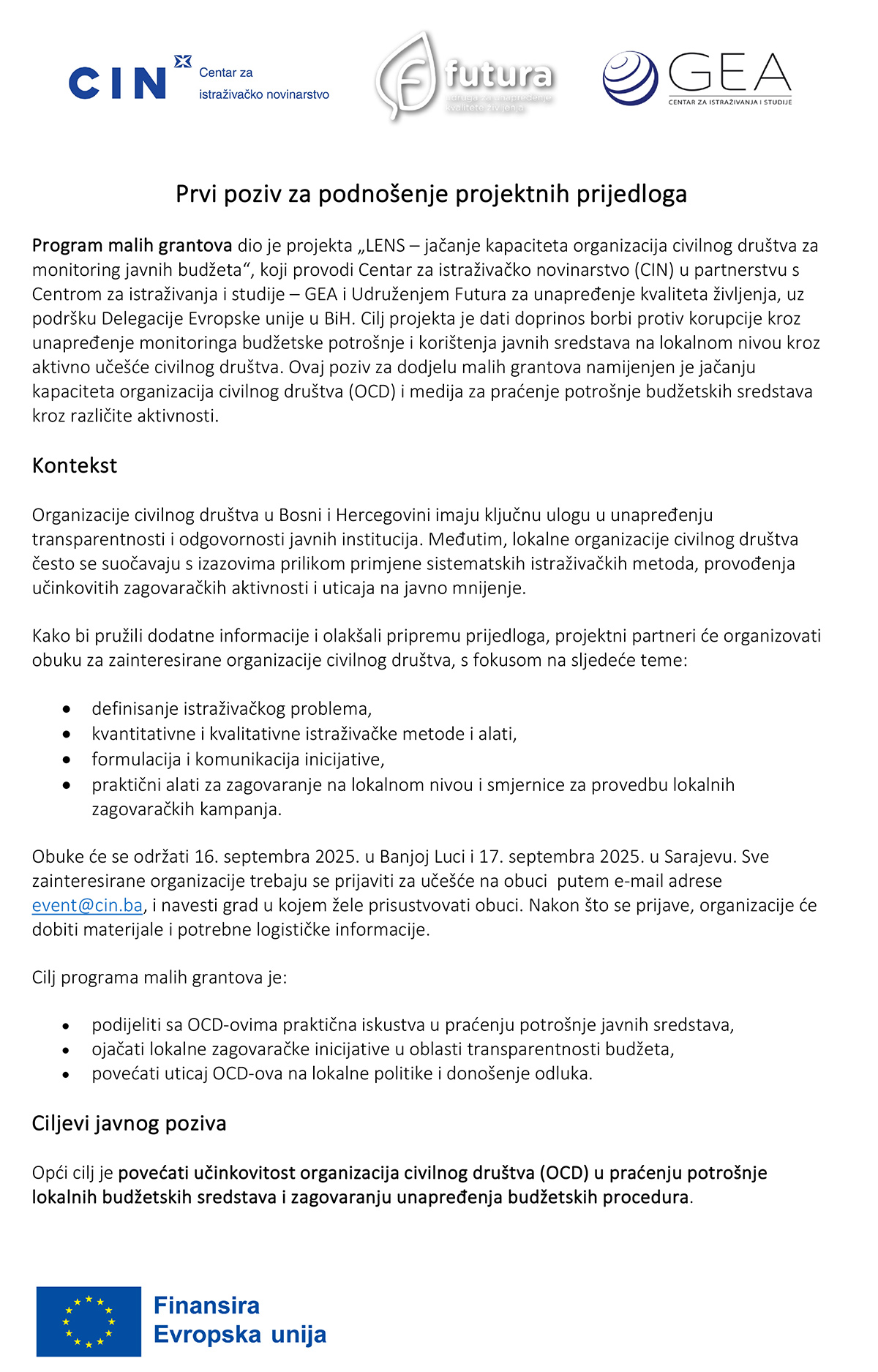 The project “LENS – Local CSOs Empowered, Networked and Strengthened for Active Budget Monitoring” is implemented by the Centre for Investigative Journalism (CIN), together with project partners the Centre for Research and Studies – GEA and the Life Quality Improvement Association Futura, with the support of the Delegation of the European Union to Bosnia and Herzegovina.