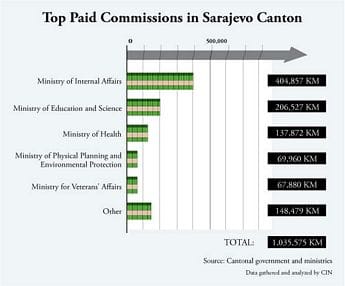 According to available records, Sarajevo Canton allocated almost 3.2 KM for commission work between 2006 and 2008. That probably means the actual figures are higher, because some ministries sent data about their commissions before the end of that year and before reporting was complete. Also, it is impossible to determine exact pay for more than 120 commissioners from the Ministry of Interior of Sarajevo Canton.