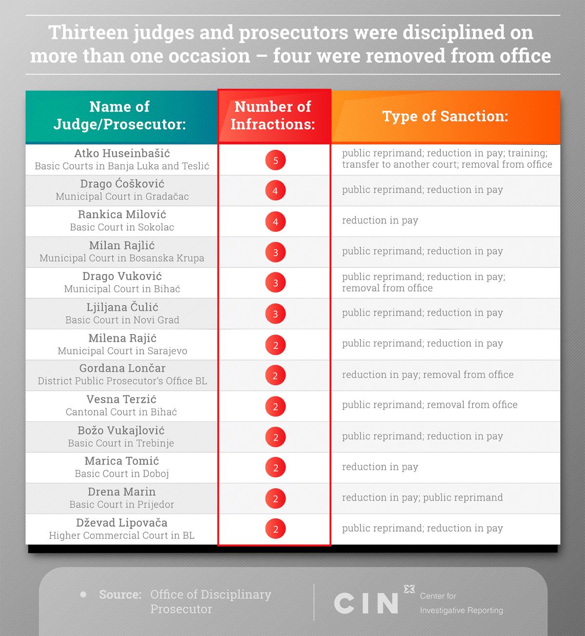Over the past nine years, HJPC’s disciplinary commissions meted out around 200 disciplinary sanctions to judges, prosecutors and expert assistants because they did not do their work responsibly. CIN reporters found that 13 had more than one sanction.