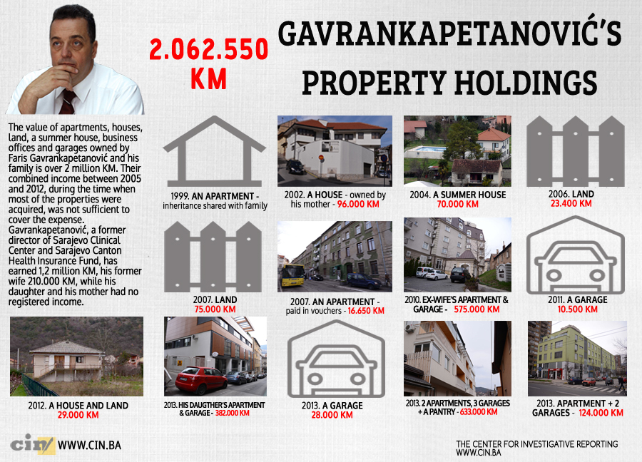 The Center for Investigative Reporting in Sarajevo (CIN) published a story in March revealing how the Gavrankapetanovićs acquired property worth two million KM while the family’s reported income could not cover such investment. Gavrankapetanović’s daughter Iman, a student without a steady job, owns and apartment and a garage worth 382,000 KM; former wife Amela owns an apartment and a garage worth 575,000 KM, mother Fikreta owns a house paid 94,000 KM while Gavrankapetanović has land and a house in Počitelj worth nearly 200,000 KM.