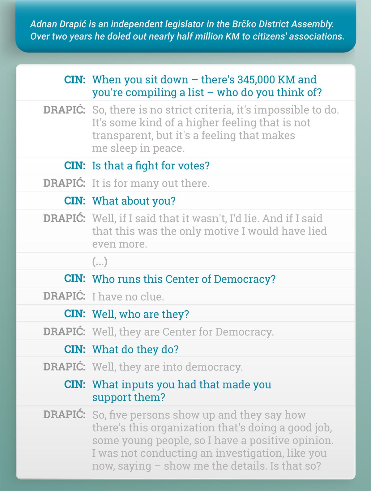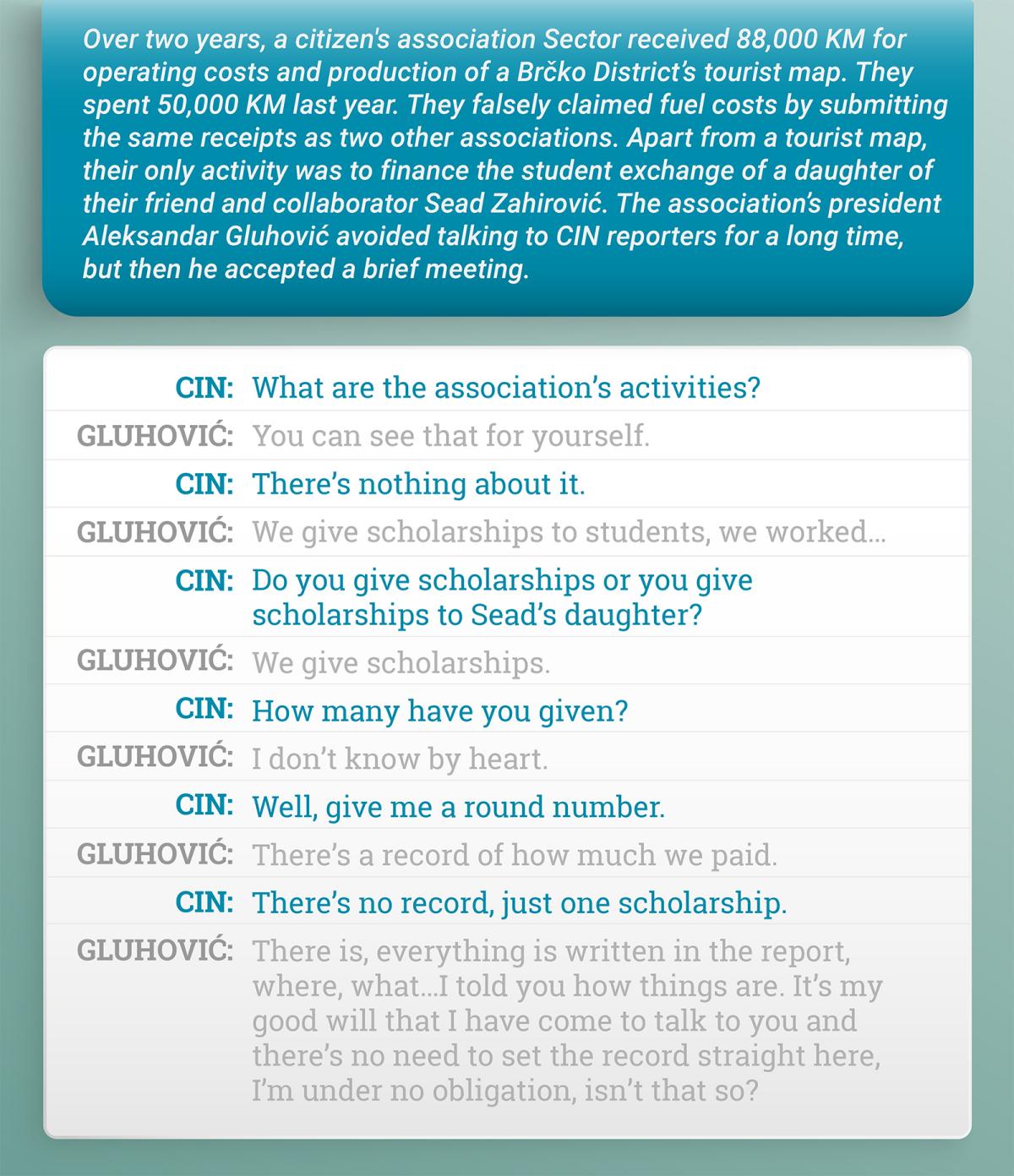 “I’m only accountable to those who give me money,” said Gluhović. “If you give me 50,000 KM, I will submit 50,000 (worth of receipts) to you – you stamp here and undersign.”