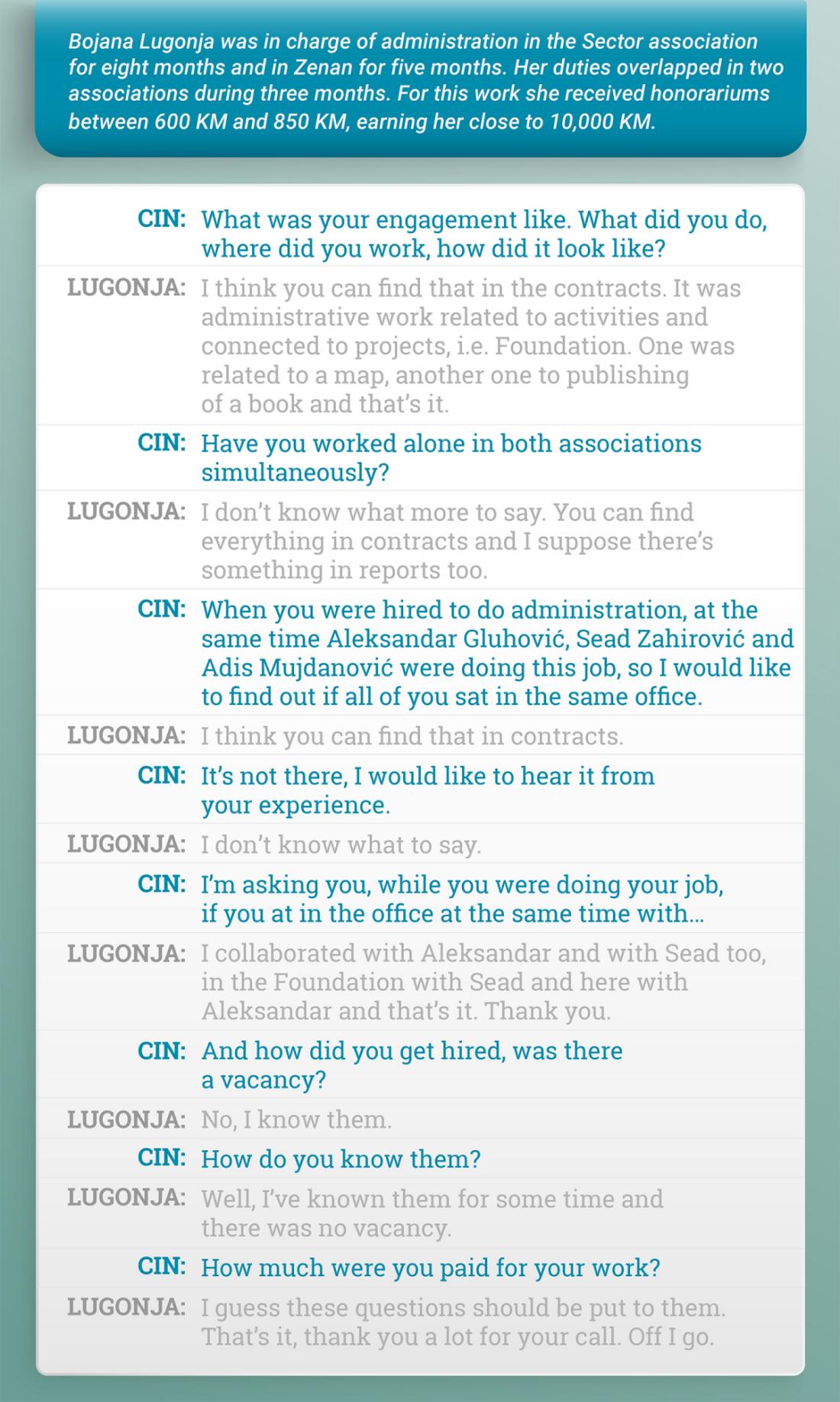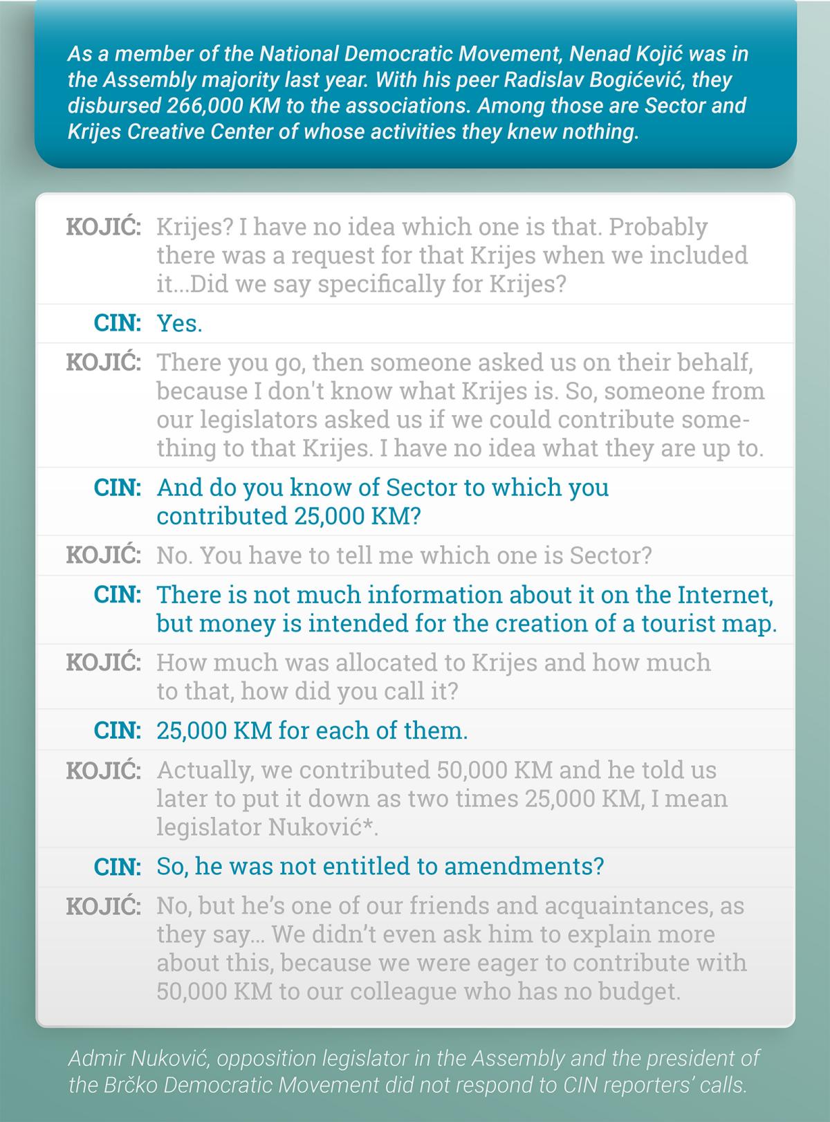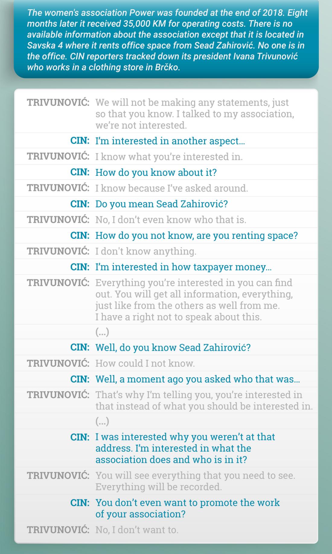 Zahirović and Ražanica seem to appear in other places too. They crop up in the report on the expenditures of the funds of the association Krijes Creative Center because they took together 11,000 KM for journalism workshops and visits to book fairs in Belgrade and Sarajevo. Last year Krijes received a 25,000 KM grant. The association’s president Sanja Stanić does not know how and she said that Zahirović took care of everything.
