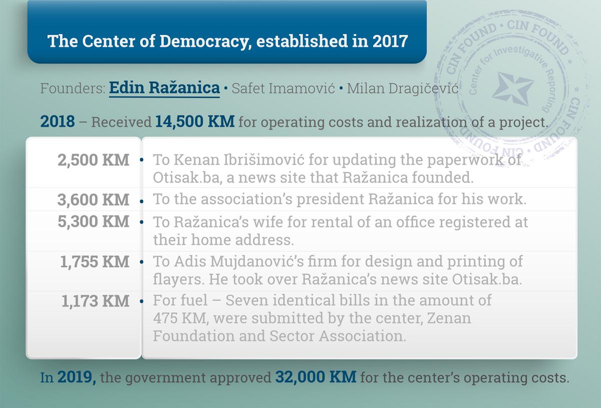 The same fuel receipts in the amount of nearly 500 KM have showed up in the expenditure records for a grant to The Center of Democracy, another association whose work is also shrouded in mystery. It is run by Edin Ražanica, a co-founder of Brčko Democratic Forum and a friend of Zahirović. He has spent nearly 9,000 KM for his honorarium and on the rent of his own house.