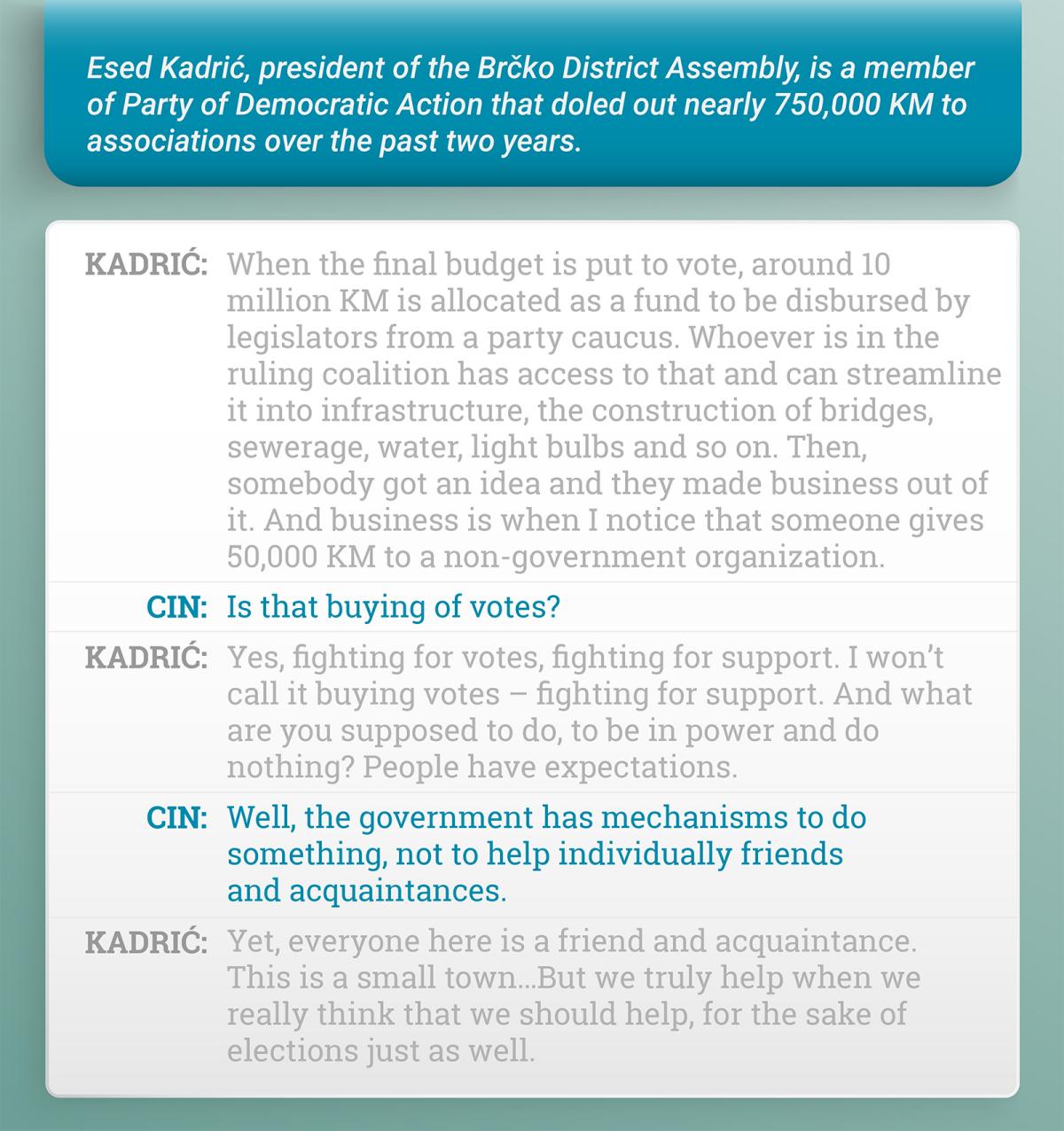 “The three of us – myself, you and your cameraman can set up an association in Brčko today and may knock on a politician’s door the very next day,” said Kadrić. “Depends who’s got what political office and we may come to arrange some deals.”