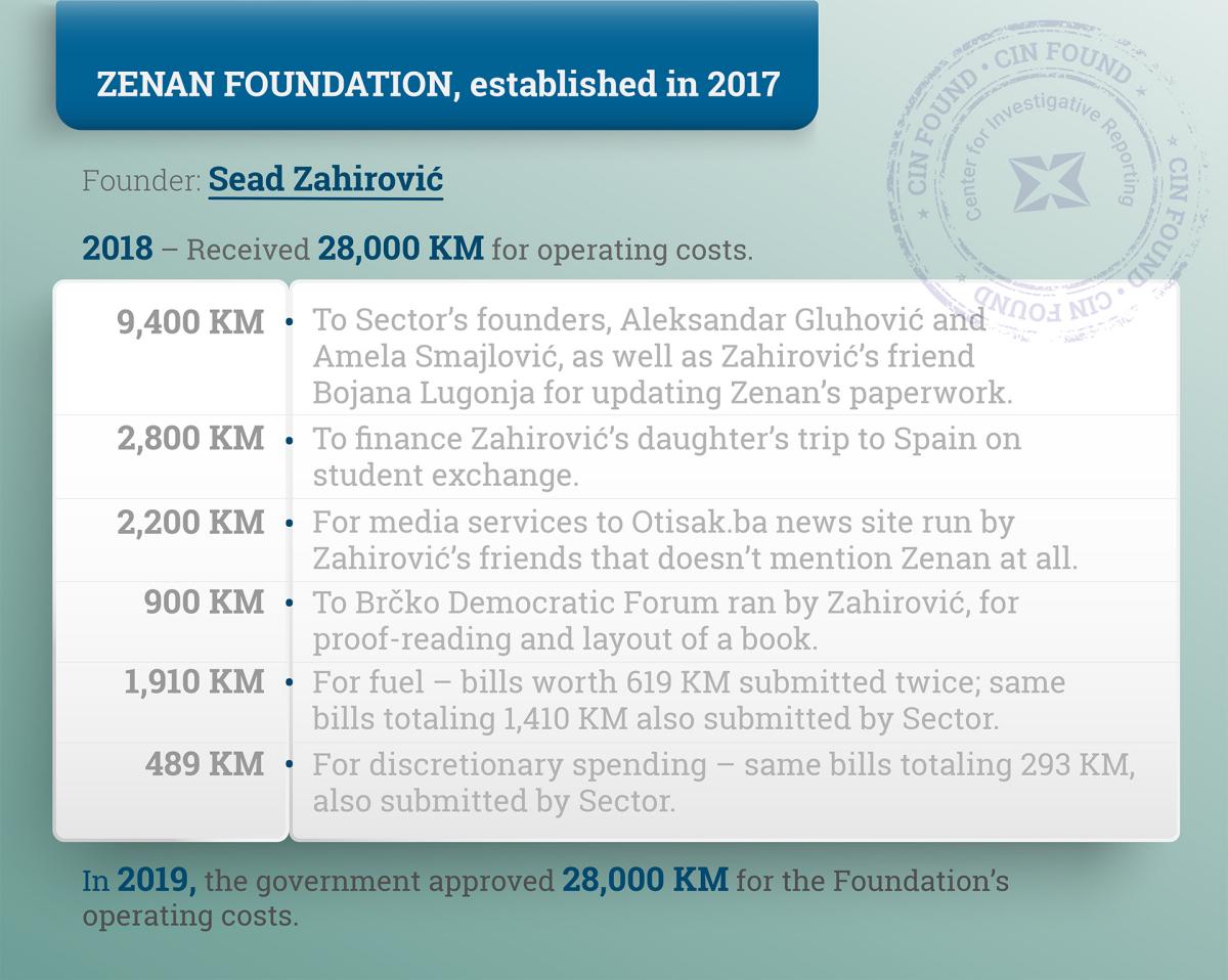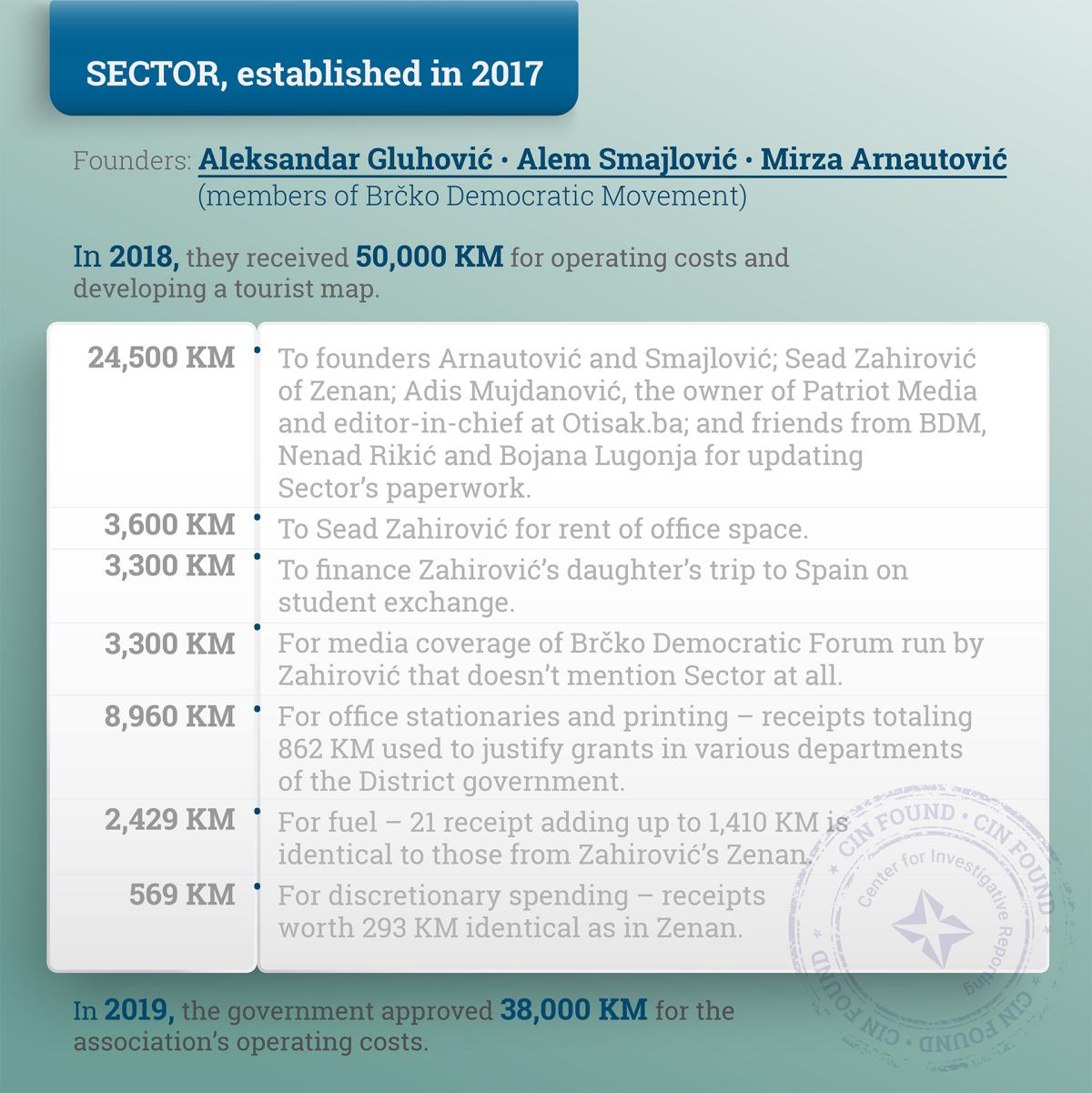 Sektor and Zenan have been around since 2017, but there is no available information about their work. These associations are connected beyond the same address. They have swapped amongst themselves and some friends 50,000 KM of taxpayer money. Sector’s president Aleksandar Gluhović got a salary from Zenan, while at the same time Sector paid Zahirović for the same job – financial manager. Several of their friends did the same work.