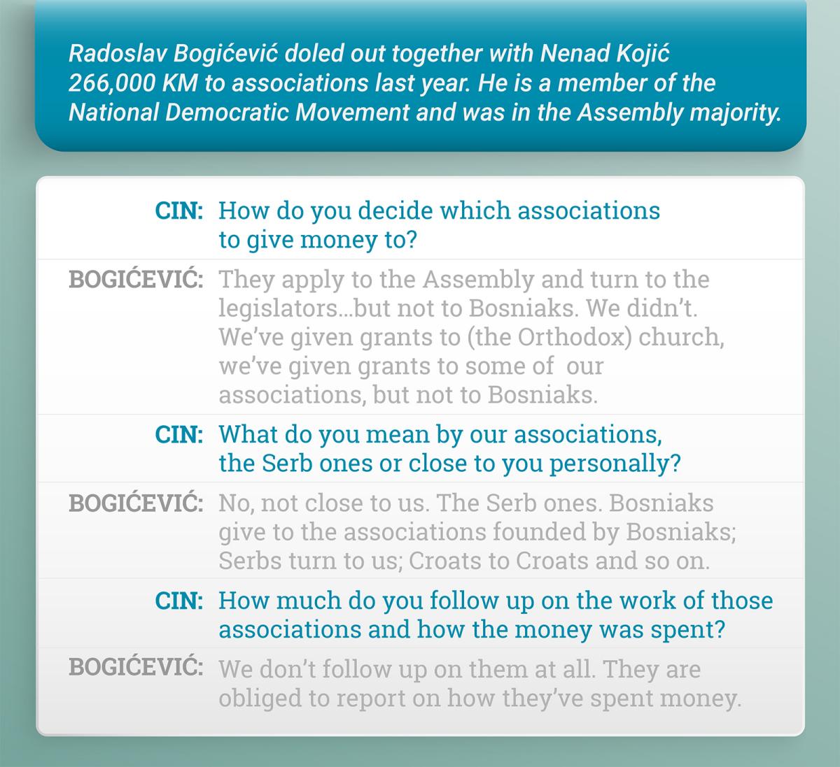 “Transparency is very low there – no public call for applications; no criteria, no rules,” said independent lawmaker Tomislav Stjepanović who doled out 106,000 KM to associations this year. “Every one of us legislators is left to decide for himself whether to choose an honest path among a too wide range of possibilities.”