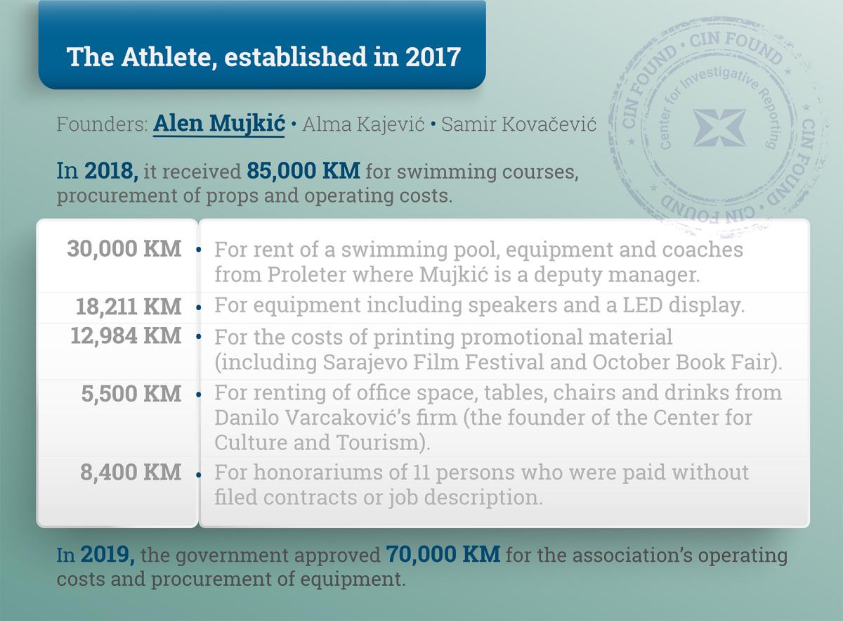 Money swapped hands also between the associations The Athlete and the Center for Culture and Tourism. Alen Mujkić and Alma Kajević are in one, while Kajević and Mujkić’s wife Aleksandra are in another. Last year, they received 185,000 KM, and more than one quarter of that money went to firms headed by Mujkić, and to a firm of Danilo Varcaković, the third founder of the Center for Culture and Tourism.