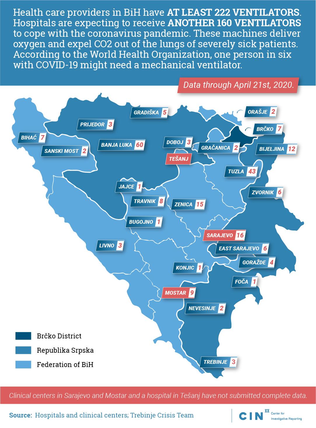 According to the records collected by the Center for Investigative Reporting in Sarajevo (CIN), there are at least 222 ventilators in BiH hospitals and clinics. Last year, authorized repair service companies certified 153 ventilators after conducting conformity assessments. Due to the coronavirus pandemic, at least another 160 machines are expected to come to the aid of healthcare providers.