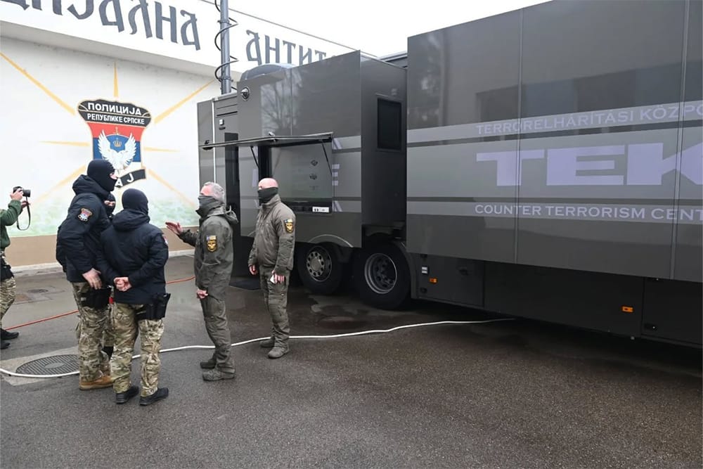 Members of Hungary’s Counter-terrorism Centre (TEK) special unit took part in a joint exercise today with the special counter-terrorism unit of the Republika Srpska Ministry of Interior (MUPRS). Photos shared by MUPRS on its official Facebook page show groups of special forces in dark uniforms standing beside a specialised vehicle.