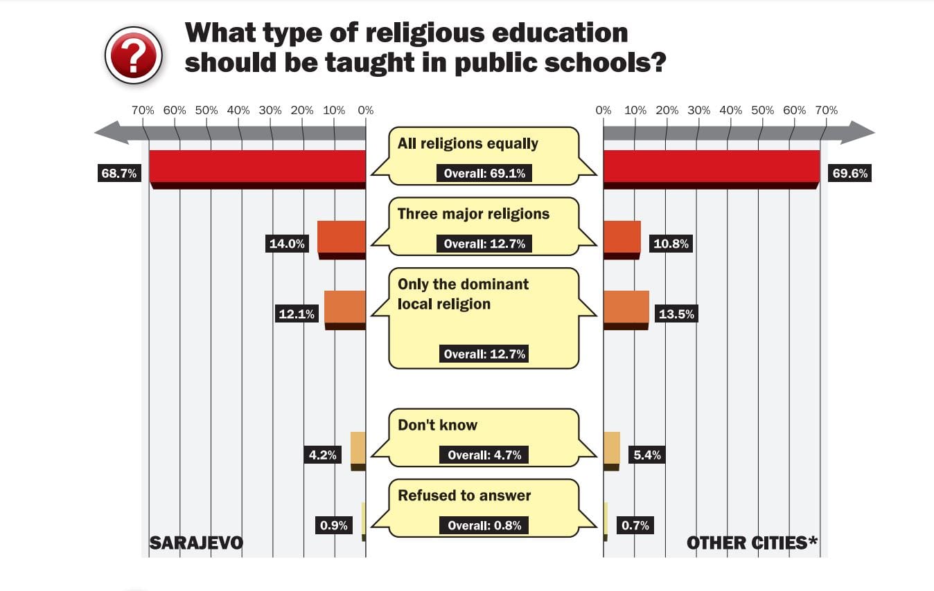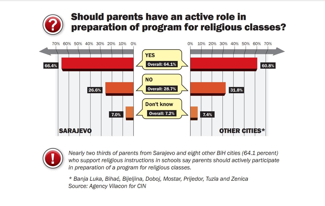 A majority of parents in Bosnia and Herzegovina (BiH) favor religion education in public schools, but their support drops on the issue of teaching religion in kindergarten, according to a poll commissioned by the Center for Investigative Reporting in Sarajevo (CIN).