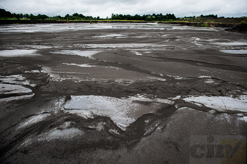This residue is mixed with water in specialized facilities and transported through pipes to a site which is like a pit filled with mud and liquid. In the summer, some liquid evaporates leaving ash that gets blown away by the wind.