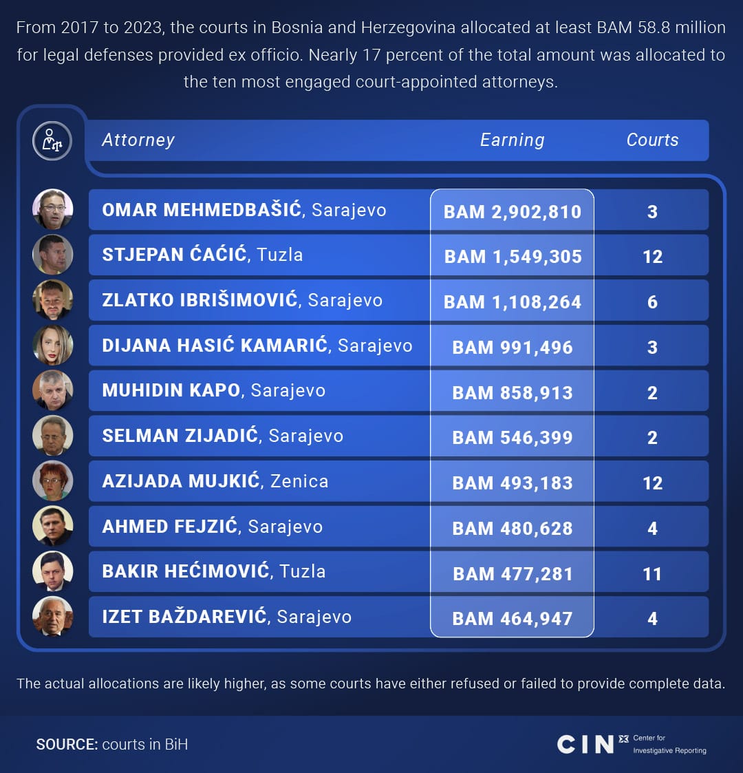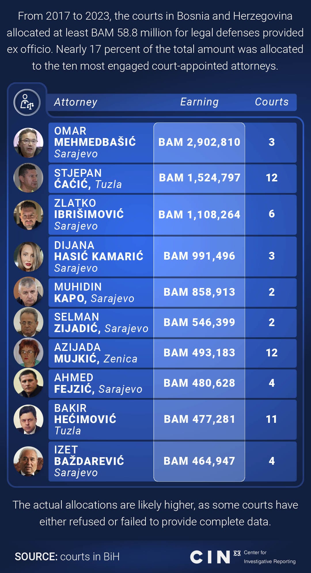 In addition to these three, among the top ten highest-paid court-appointed attorneys are Dijana Hasić Kamarić, Muhidin Kapo, Selman Zijadić, Ahmed Fejzić, and Izet Baždarević from Sarajevo, Azijada Mujkić from Zenica, and Bakir Hećimović from Tuzla.