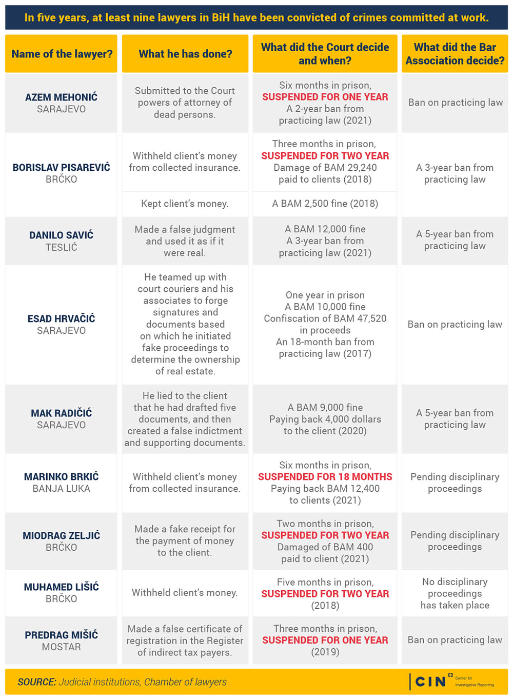 In five years, at least nine lawyers in Bosnia and Herzegovina were convicted of abuse of position, abuse of trust of clients, and document forging. Six were banned from practicing law.