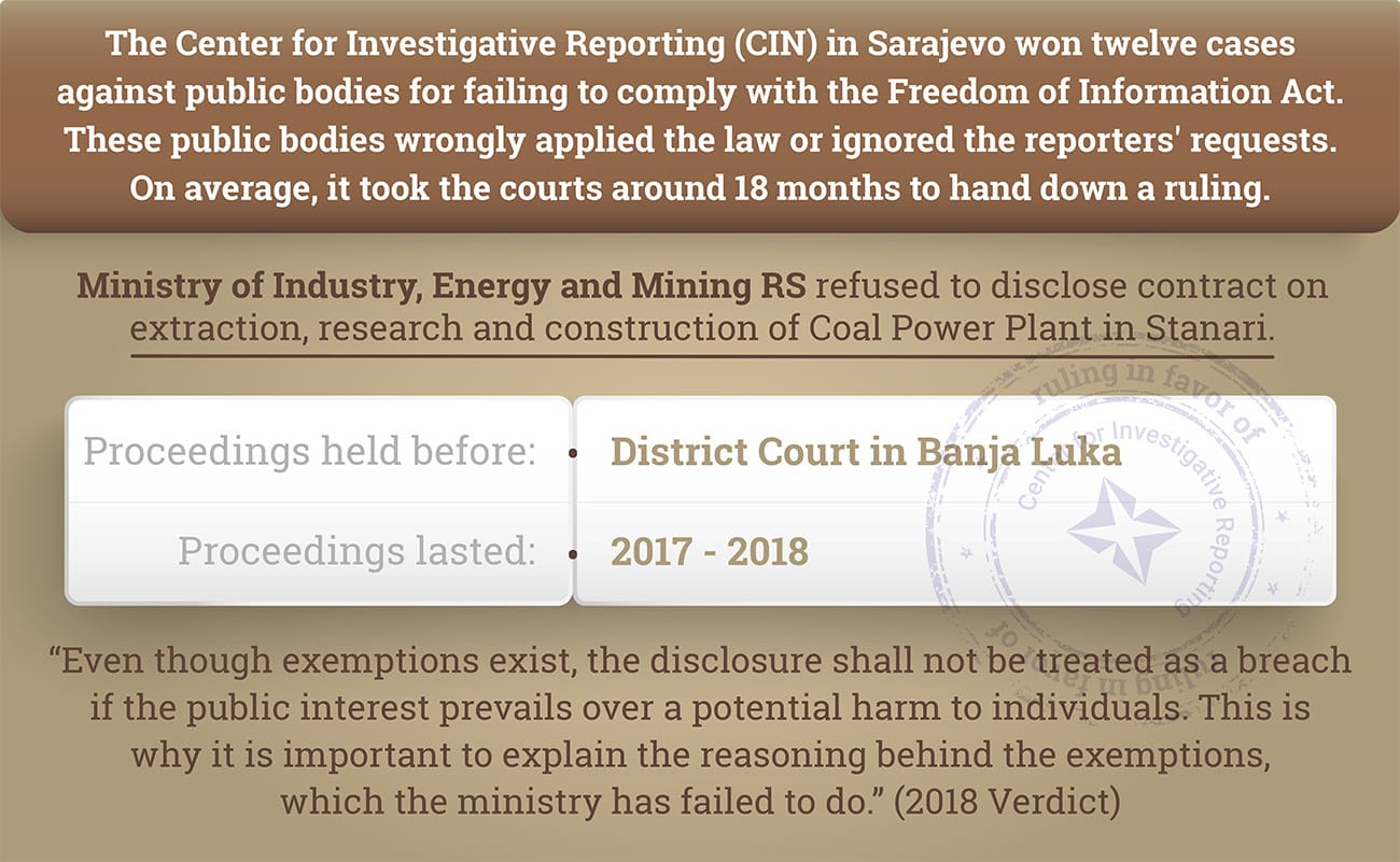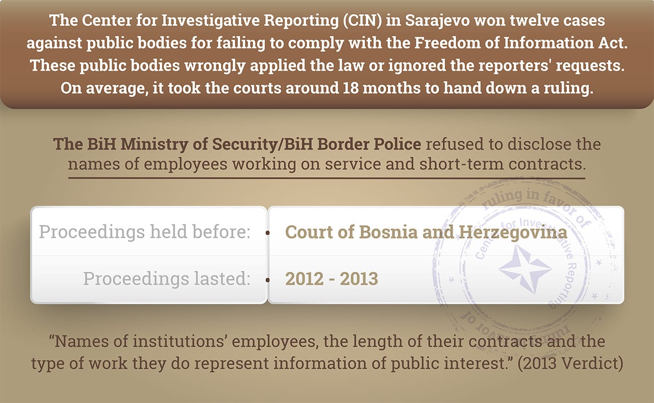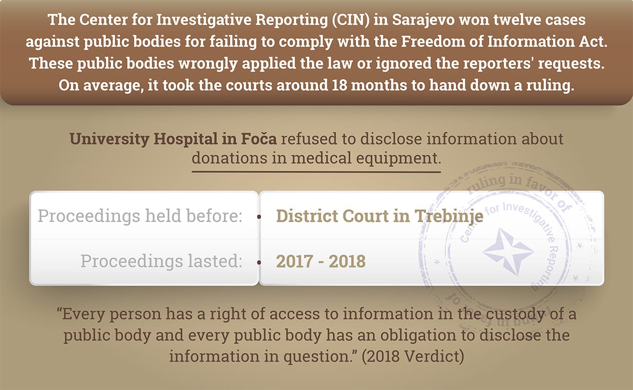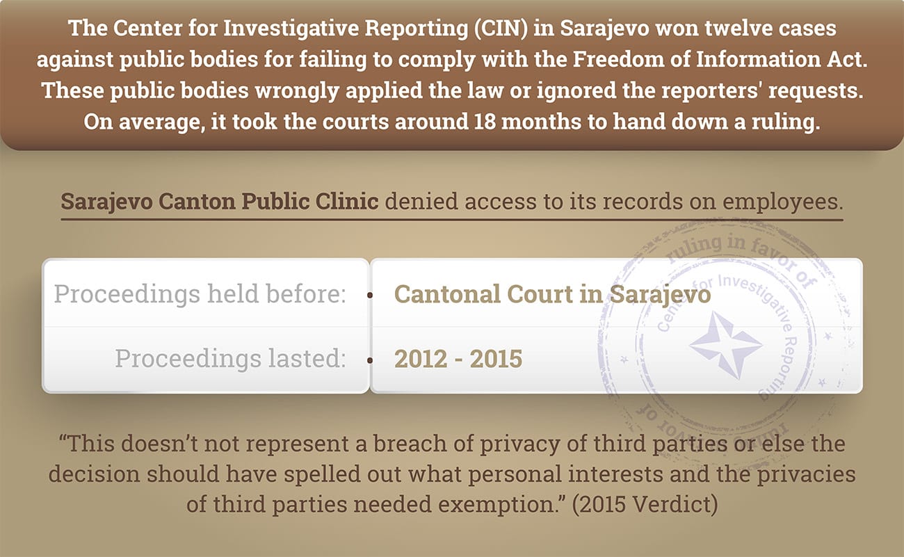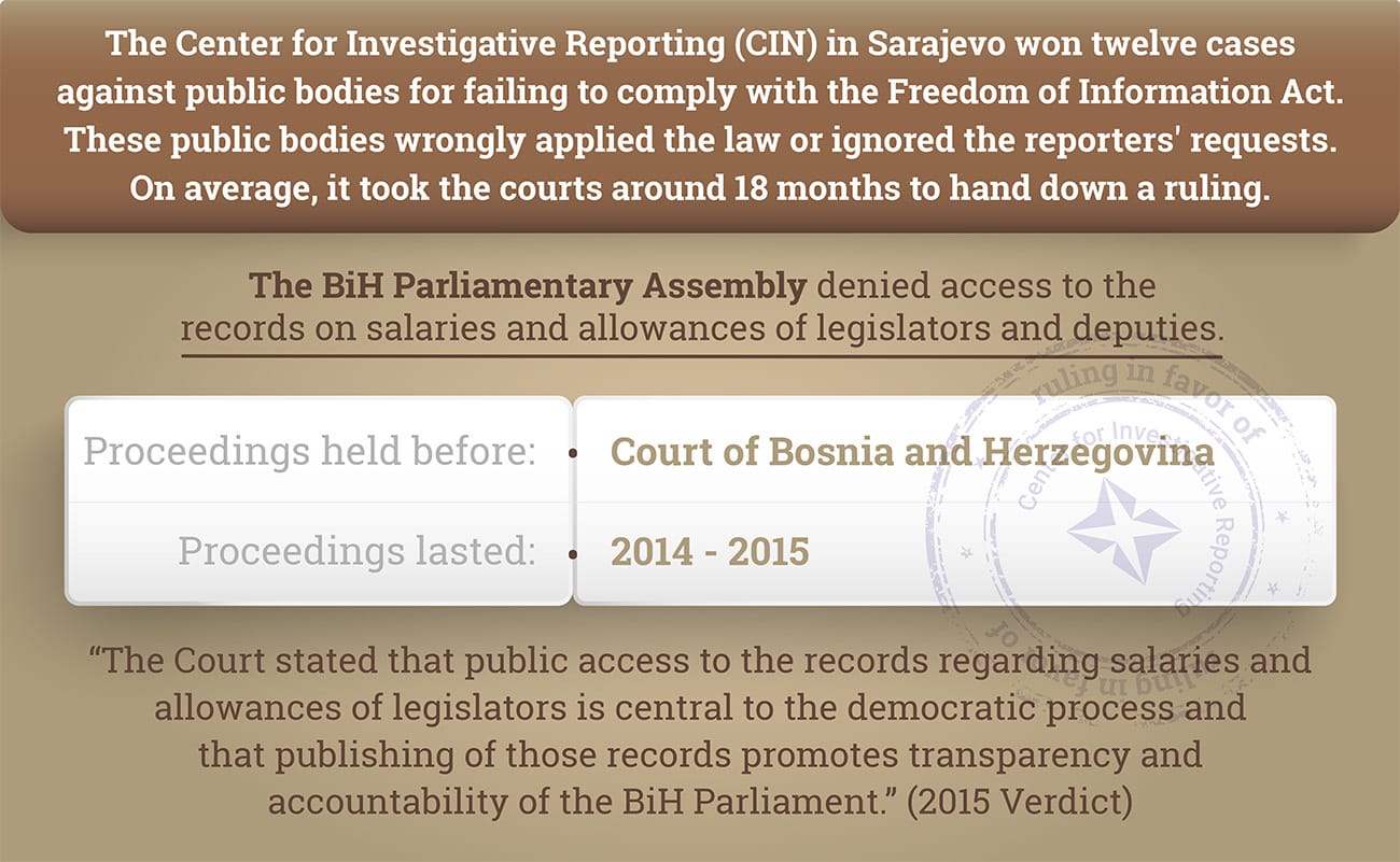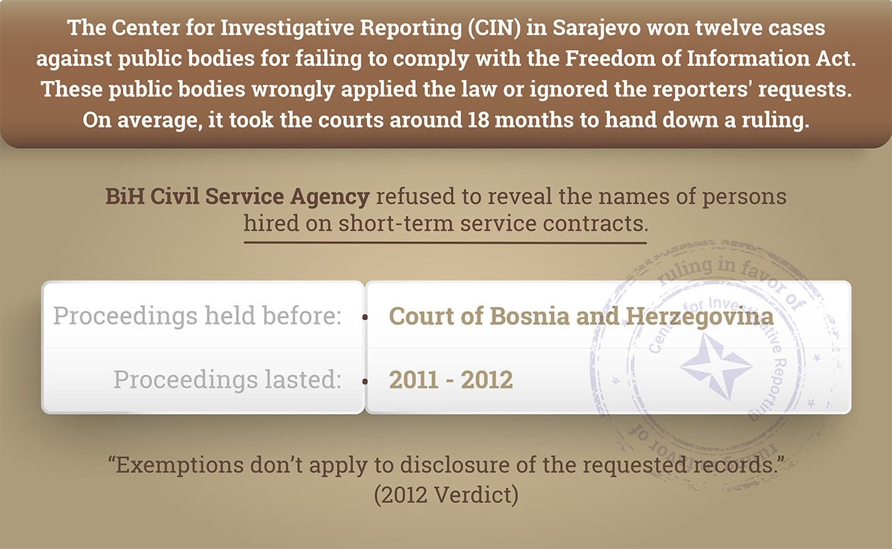 This is the twelfth ruling for withholding public information or breach of FOIA that BiH courts have handed down in CIN’s favor. In the past, public bodies and government agencies turned down CIN’s FOIA requests by wrongly applying the law or by ignoring reporters’ requests.