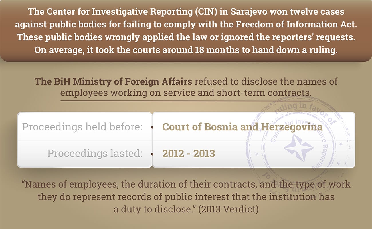 This mid-September, the Cantonal Court in Sarajevo has ruled in favor of to the Center for Investigative Reporting (CIN) in Sarajevo in a judicial review case against the Federation of Bosnia and Herzegovina (FBiH) Ministry of Displaced Persons and Refugees after the ministry denied reporters access to the records on grant beneficiaries.