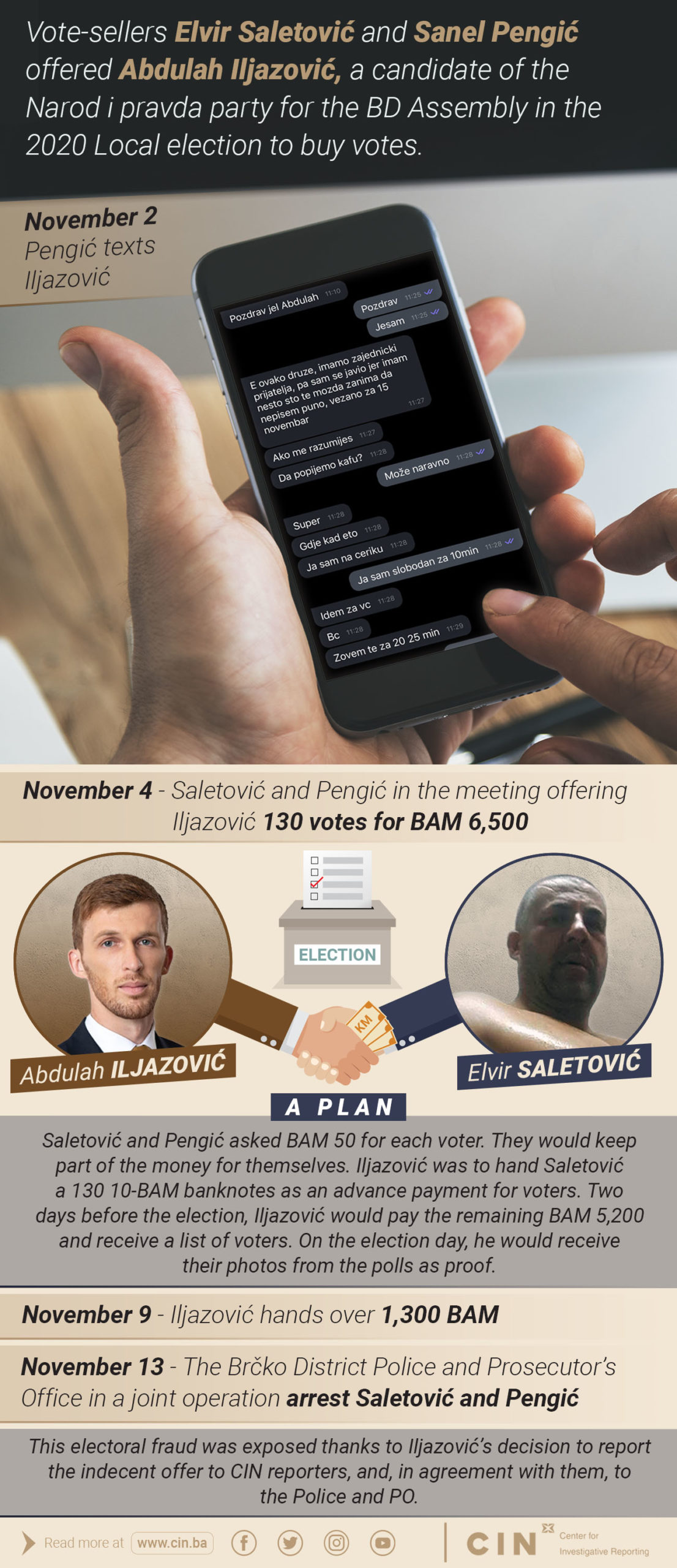 Two weeks before the 2020 Local elections, Abdulah Iljazović, a candidate for the Brčko District Assembly, received a phone call from an unknown number. He agreed to the proposal and met Pengić and Saletović, both of whom are convicted of drug dealing. Pengić offered his assistance, claiming to have a buddy who sells votes in the elections, but Iljazović declined it.