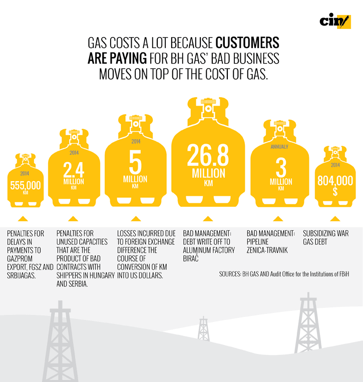 Even though the FBiH government could lower the price because it has a say on the price, it chose instead to offset BH Gas losses through higher gas prices. The customers pay for unpaid bills; harmful contracts on the transport of natural gas; bad investments and fees paid to go-betweens as well as for gas bills never paid during the 1992-1995 war.