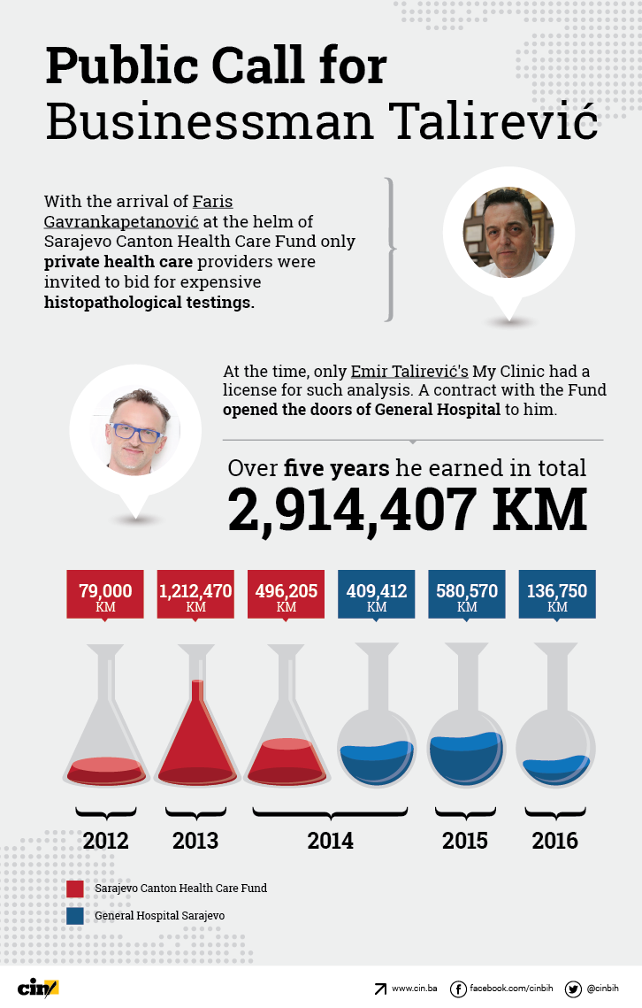 My Clinic got the first contract for histopathological services from KCUS at the time when Gavrankapetanović was at its helm. Talirević said that no tender was put out for this contract and called it a pilot project worth 6,000 KM.