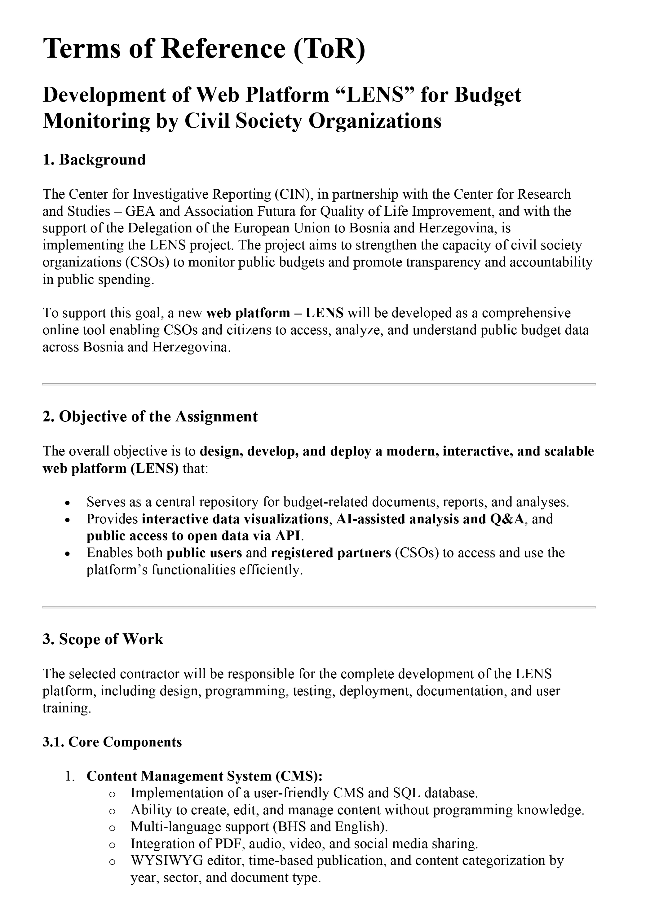 This public call covers the design, development, and implementation of a modern, interactive, and scalable web platform (LENS).