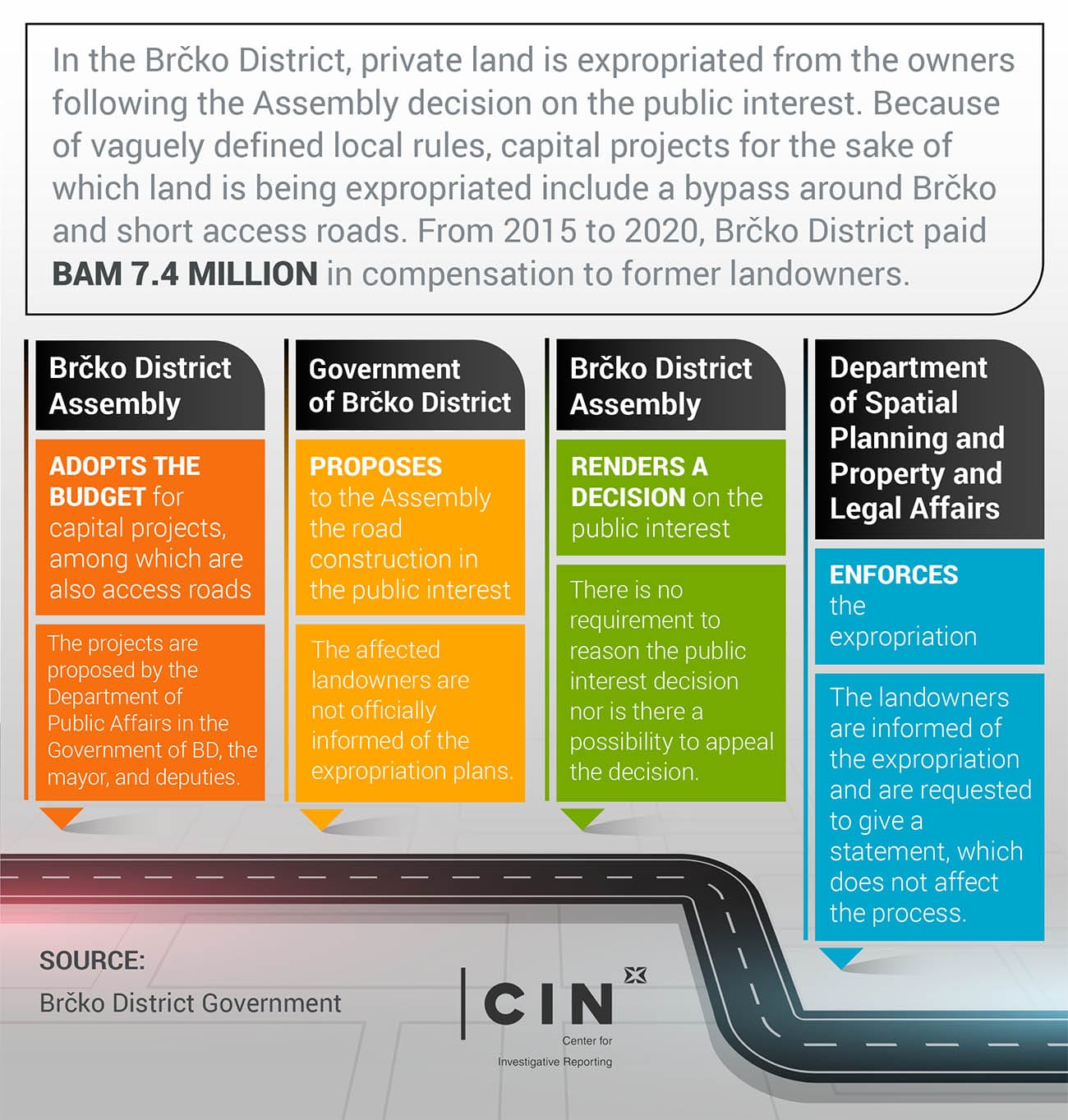 Under the Land Expropriation Act of Brčko District, private land shall be expropriated from the owners based on a decision of the Assembly – rendered at the proposal of the Government – declaring that the construction is in the public interest. The Act does not require the institutions to reason such a decision, nor does it allow citizens to appeal it. Moreover, the Act does not require the ower’s consent for expropriation either.