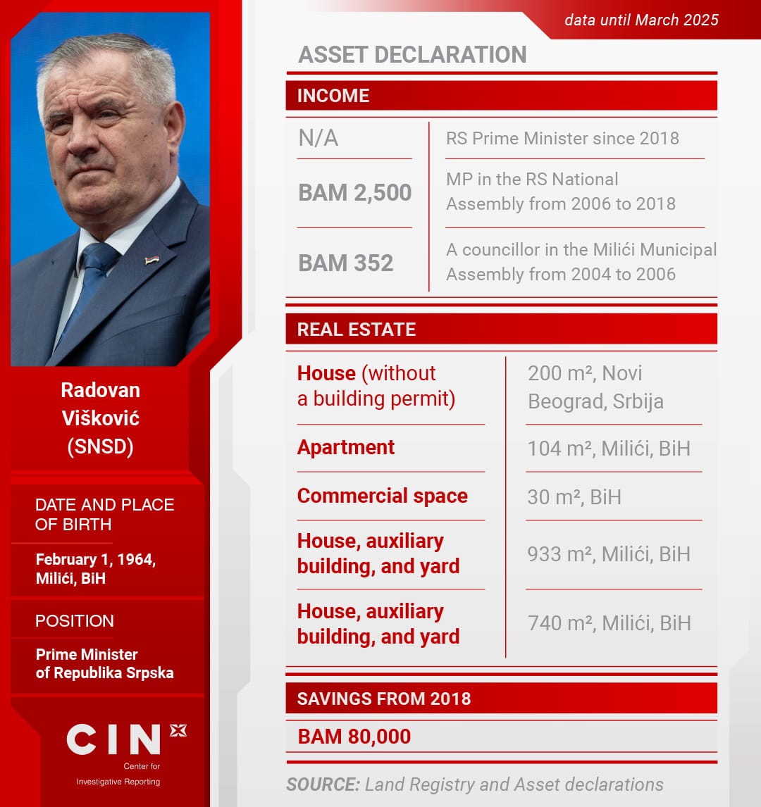 In his most recent asset declaration from 2018, submitted to the Central Election Commission (CIK), Višković reported owning a 104-square-meter flat and a 30-square-meter commercial property in RS, which he valued at a total of BAM 60,000. The flat is located in Milići, according to the land registry. He also valued his house in Serbia at BAM 180,000 in the same year. However, according to the Property Cadastre of the Republic Geodetic Authority of Serbia, the house was built without the required construction permit.