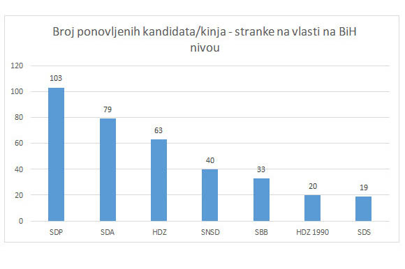 SDP has the most returning candidates on its lists or 103 persons who are in office during the ongoing term. SDA has nominated 79 persons who held office during this term, while SNSD has nominated 40 “returning” candidates; HDZ BiH – 63; SBB – 33; People’s Party Work for Betterment – 22; HDZ 1990 – 20; SDS – 1;, DNS with the coalition partners – six; SP RS – three; and HSP with coalition partners has seven candidates.