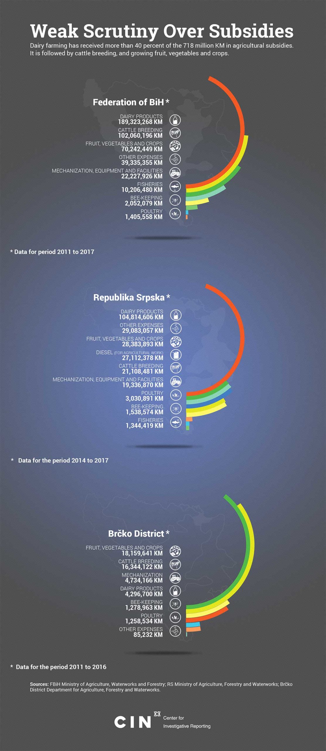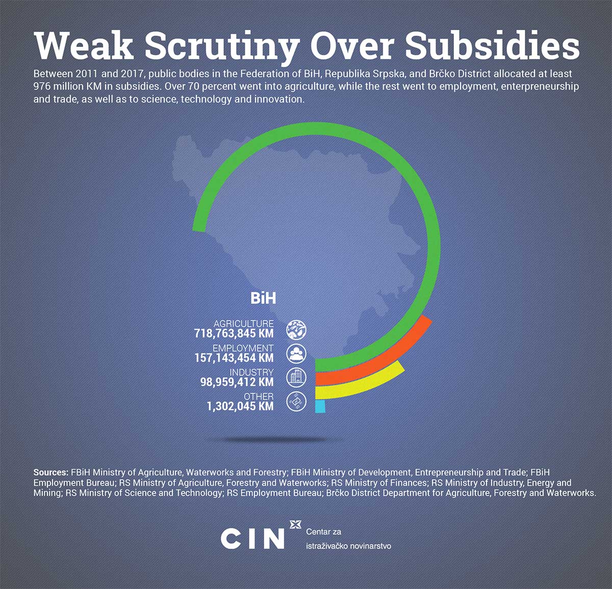 Between 2011 and 2017, nine public bodies in Bosnia and Herzegovina (BiH) allocated at least 976 million KM in subsidies for agriculture, employment and industry. Reporters from the Center for Investigative Reporting in Sarajevo (CIN) have collected records about how this money was spent and created a database combining records on the approved and paid subsidies in the Federation of BiH (FBiH), Republika Srpska (RS) and the Brčko District.
