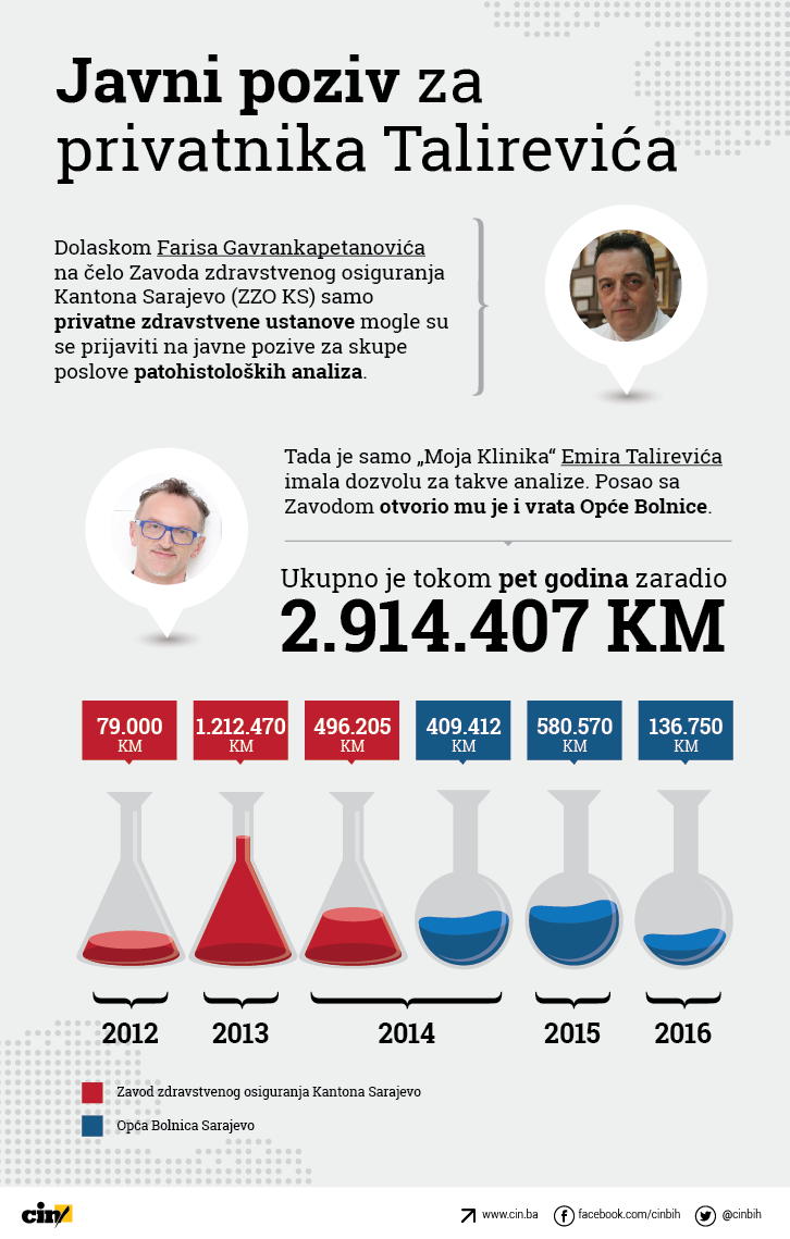 Za tri godine pružanja usluga patohistologije „Moja Klinika“ je od Zavoda naplatila skoro 1,8 miliona KM. Gavrankapetanović nije odgovarao na pozive i poruke novinara CIN-a.