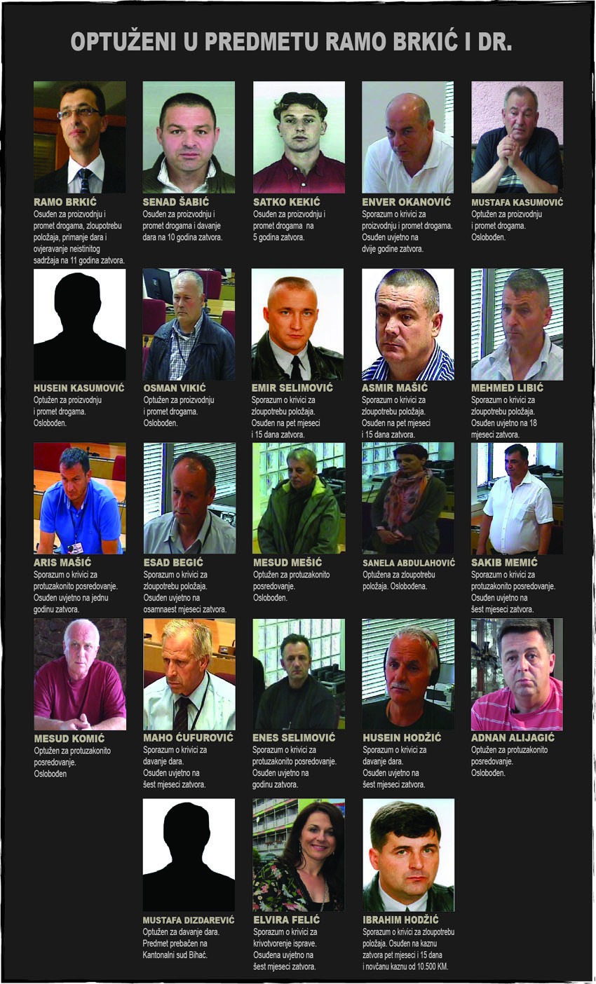 Ramo Brkić, bivši komesar Policije Unsko-sanskog kantona (USK), osuđen je na 11 godina zatvora, Senad Šabić na 10 godina i Satko Kekić na pet godina. Kazna im je izrečena zbog proizvodnje i trgovine drogom, zloupotrebe položaja i korupcije.