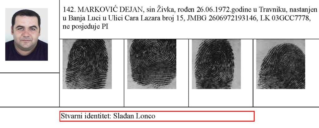 Utvrđeno je da je Lonco od 2003. godine koristio lažno ime Dejan Marković zahvaljujući ličnoj karti na to ime koju je dobio u CIPS kancelariji u Banja Luci. Ličnu kartu je dobio na isti način na koji su i Tovilović i Knežević obezbjeđivali dokumente svojim klijentima.