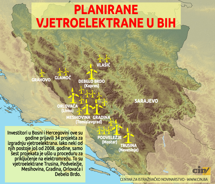Zbog toga je Državna regulatorna komisija za električnu energiju (DERK) prije dvije godine odredila da se do 2019. godine na prijenosnu mrežu može priključiti maksimalno 350 MW instalirane snage iz vjetroelektrana. Dva entiteta su se dogovorila da 230 MW pripadne Federaciji, a 120 MW Republici Srpskoj. Entitetska ministarstva energetike, industrije i rudarstva su potom napravila liste budućih vjetroelektrana za priključenje na mrežu. Osim onih na Trusini, Mesihovini i Podveležju, trebale bi se graditi i kod Tomislavgrada i Livna te na Kupresu.